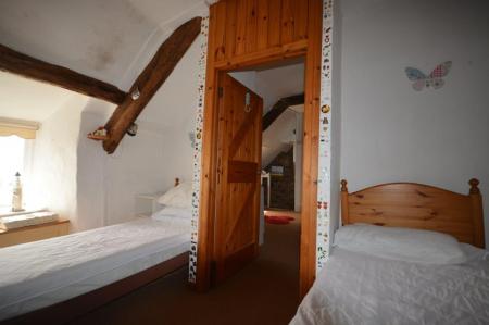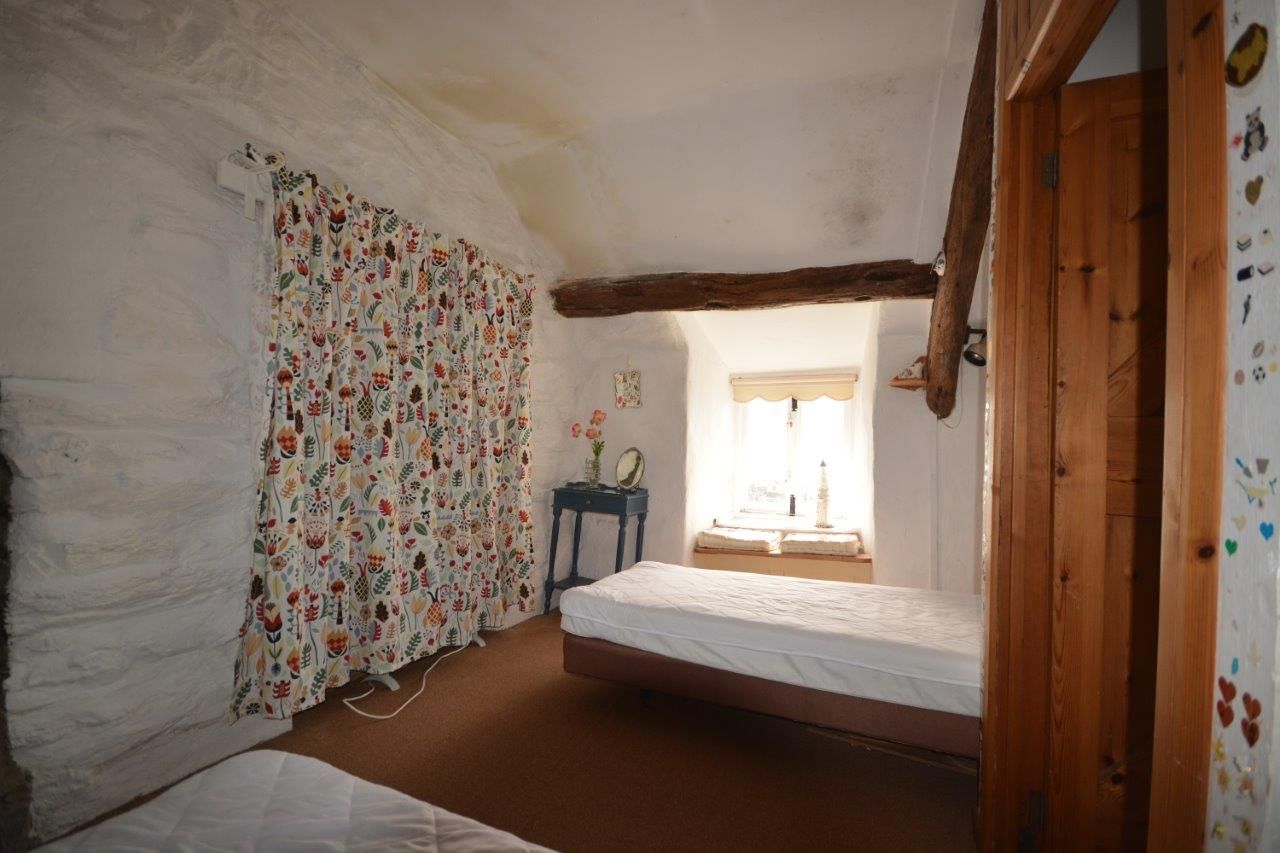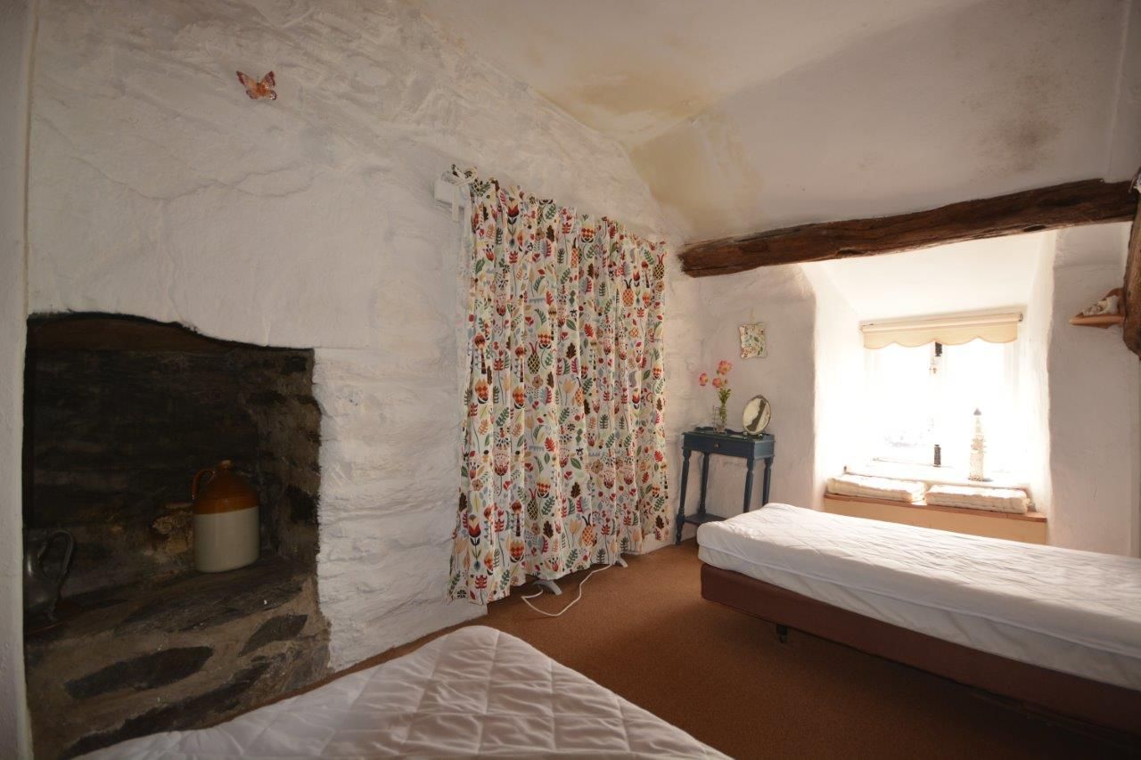 Window to front with spectacular views, tongue and groove ceiling, exposed beams, exposed stone walls, impressive stone inglenook with oak beam and slate hearth, original bread oven and slate shelving, stairs, electric storage heater, carpet.