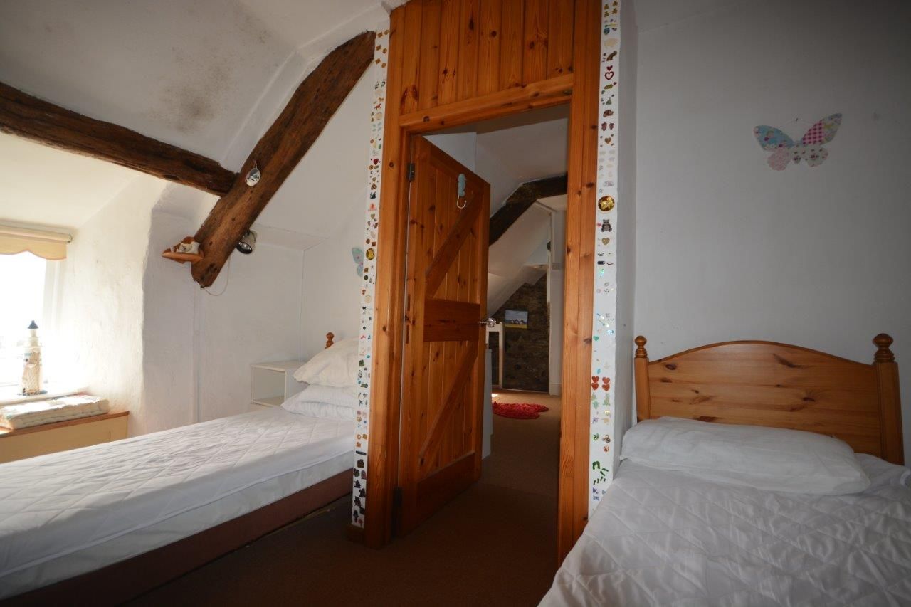 Window to front with views, door to side leading to garden, exposed beams and 'A' frame, painted exposed stone wall, stone inglenook fireplace, cupboard housing water tank, electric storage heater, carpet.