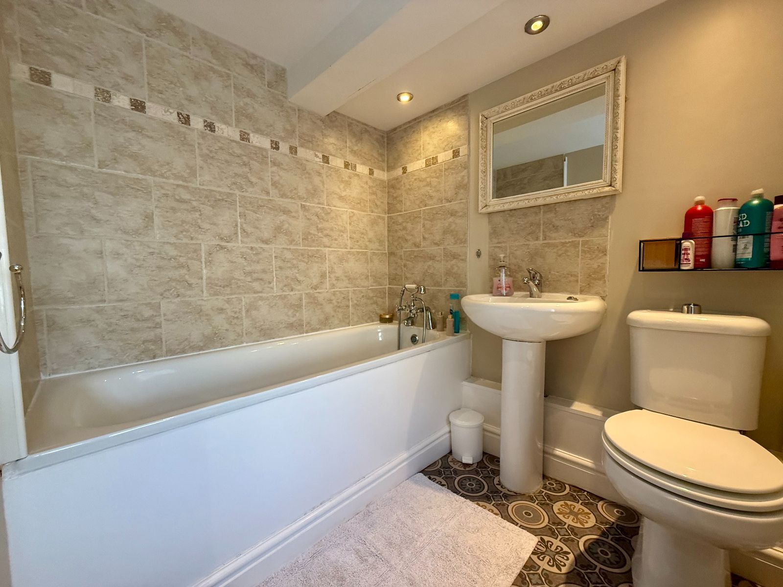 Window to front, panel bath with mixer shower tap, W.C., wash hand basin, partly tiled walls, radiator, cushion flooring.