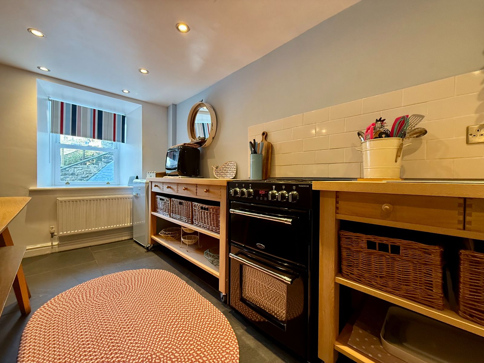 Window to front, exposed beam, spotlights, exposed stone wall, 3 base units under a wood effect worktop, free standing kitchen units, space for fridge, space for freezer, gas hob with electric oven, stainless steel square sink with tiled splash back, under stairs cupboard, 2 radiators, slate floor flooring.