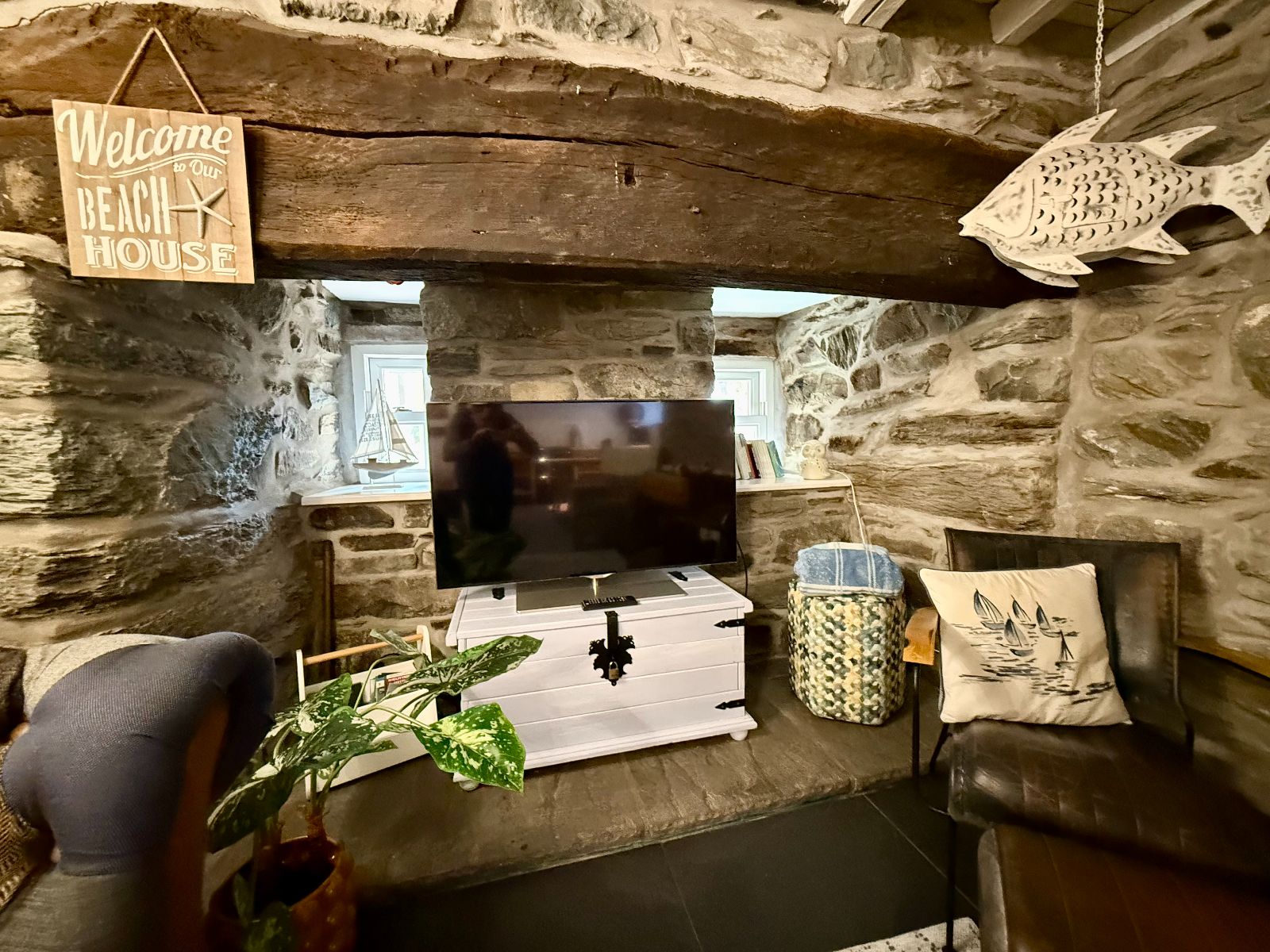 Two small windows in inglenook, exposed beams, exposed stone walls, large inglenook fireplace with oak mantle above and stone hearth, radiator, slate tile flooring.