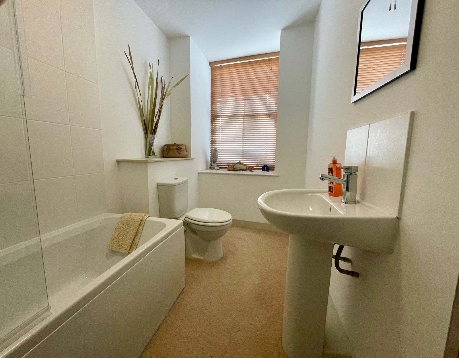 Window to side, panel bath with shower mixer taps, W.C., wash hand basin, heated towel rail, partly tiled walls, carpet.