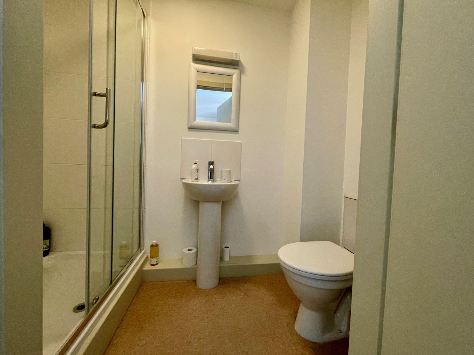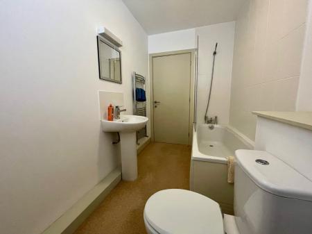 Mains shower. W.C., wash hand basin, extractor fan, part tiled walls, heated towel rail, carpet.