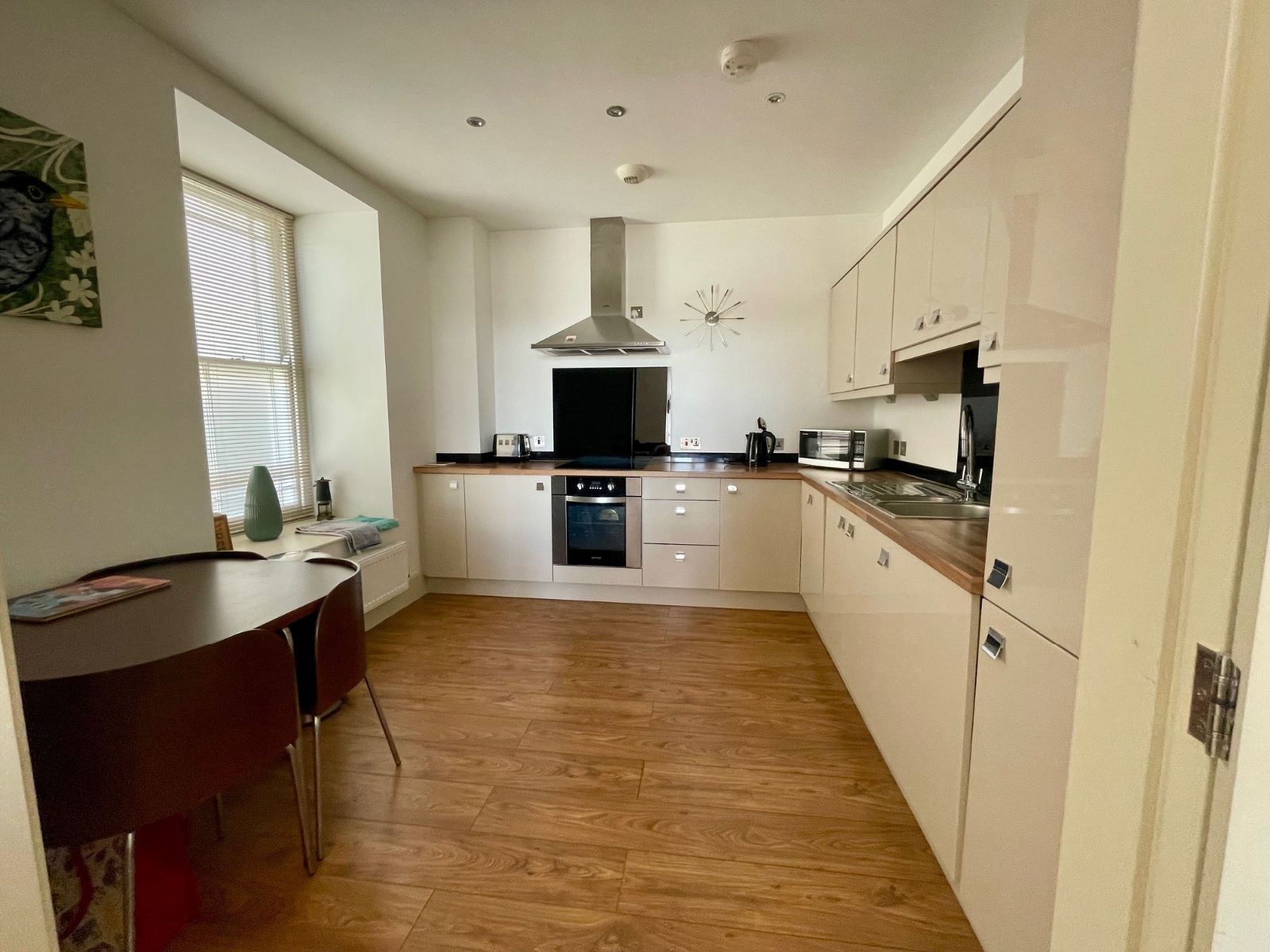 Window to side, 5x wall units, 8x base units under wood effect work tops, integral dishwasher, integral washing machine, electric oven, ceramic/induction hob with extractor fan above, larder unit housing integral fridge/freezer, stainless steel sink and drainer, tiled up standings, radiator, laminate flooring.