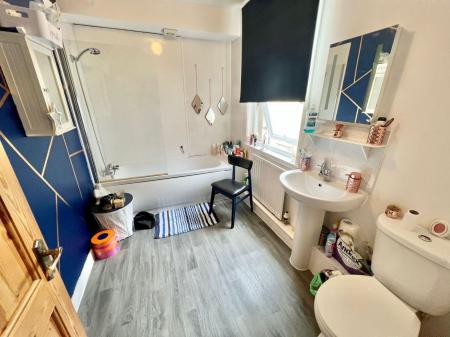 Window to rear, panel bath with mixer tap, marble effect splash back, W.C., pedestal wash hand basin, extractor fan, radiator.