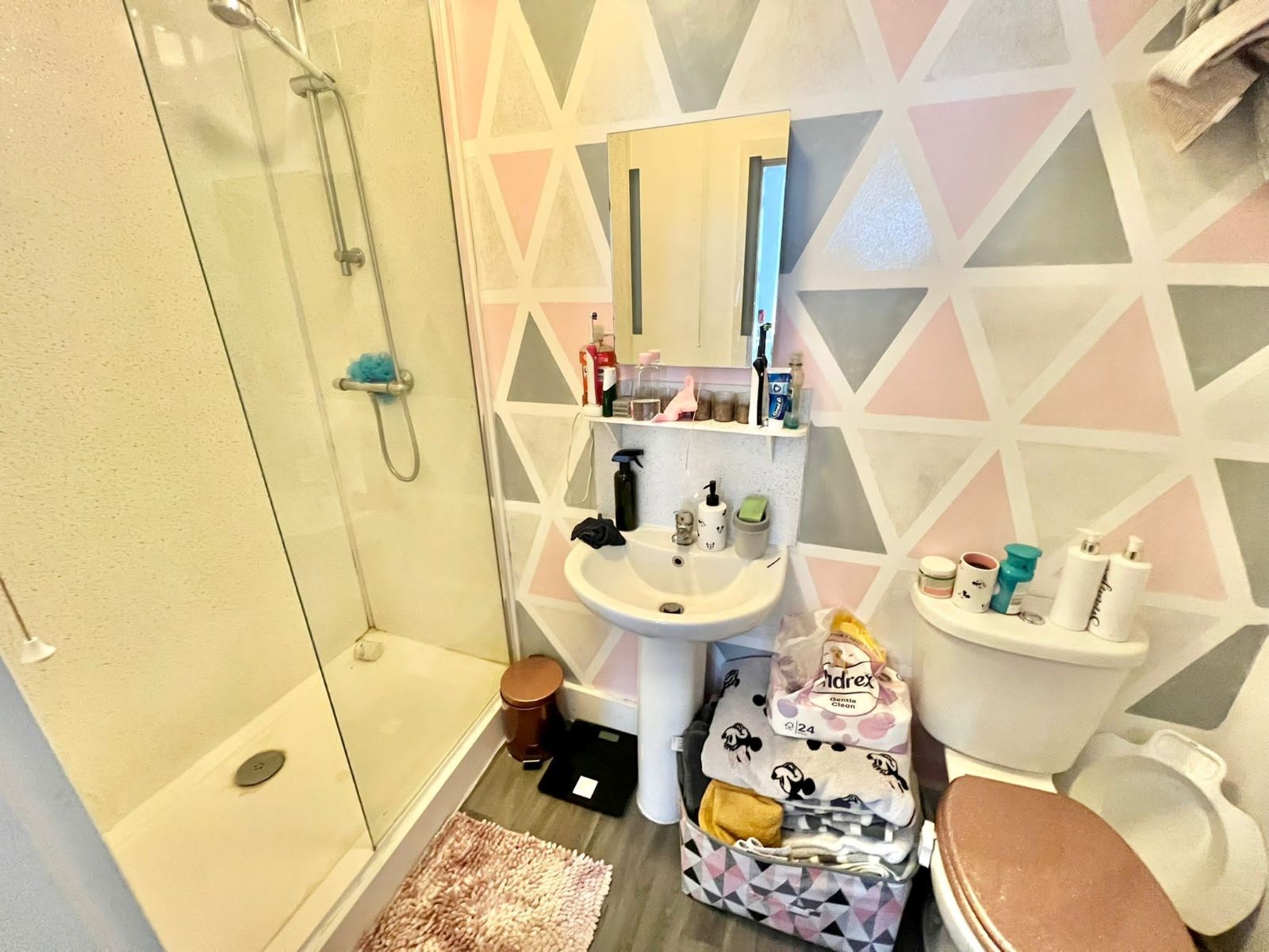 Double mains shower with marble effect splashbacks, pedestal wash hand basin, W.C., extractor fan, heated towel rail.