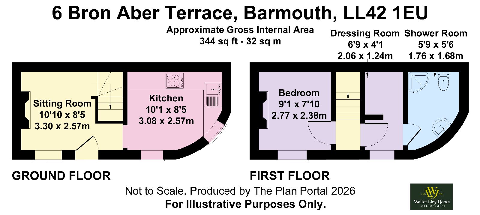 The layout briefly comprises: entrance door opening into the sitting room, kitchen/dining room, first-floor landing, bedroom, dressing room, and shower room.