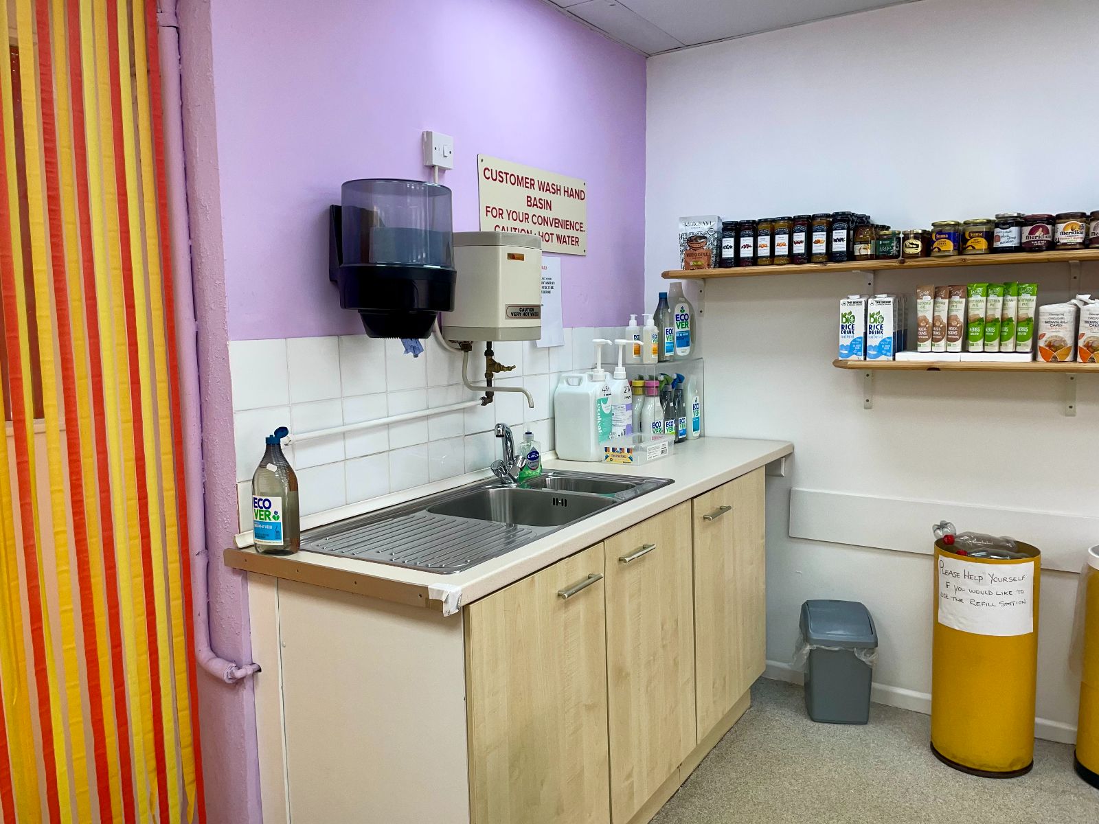 Shop wide picture windows, open floor plan, stainless steel sink and drainer, utility area.