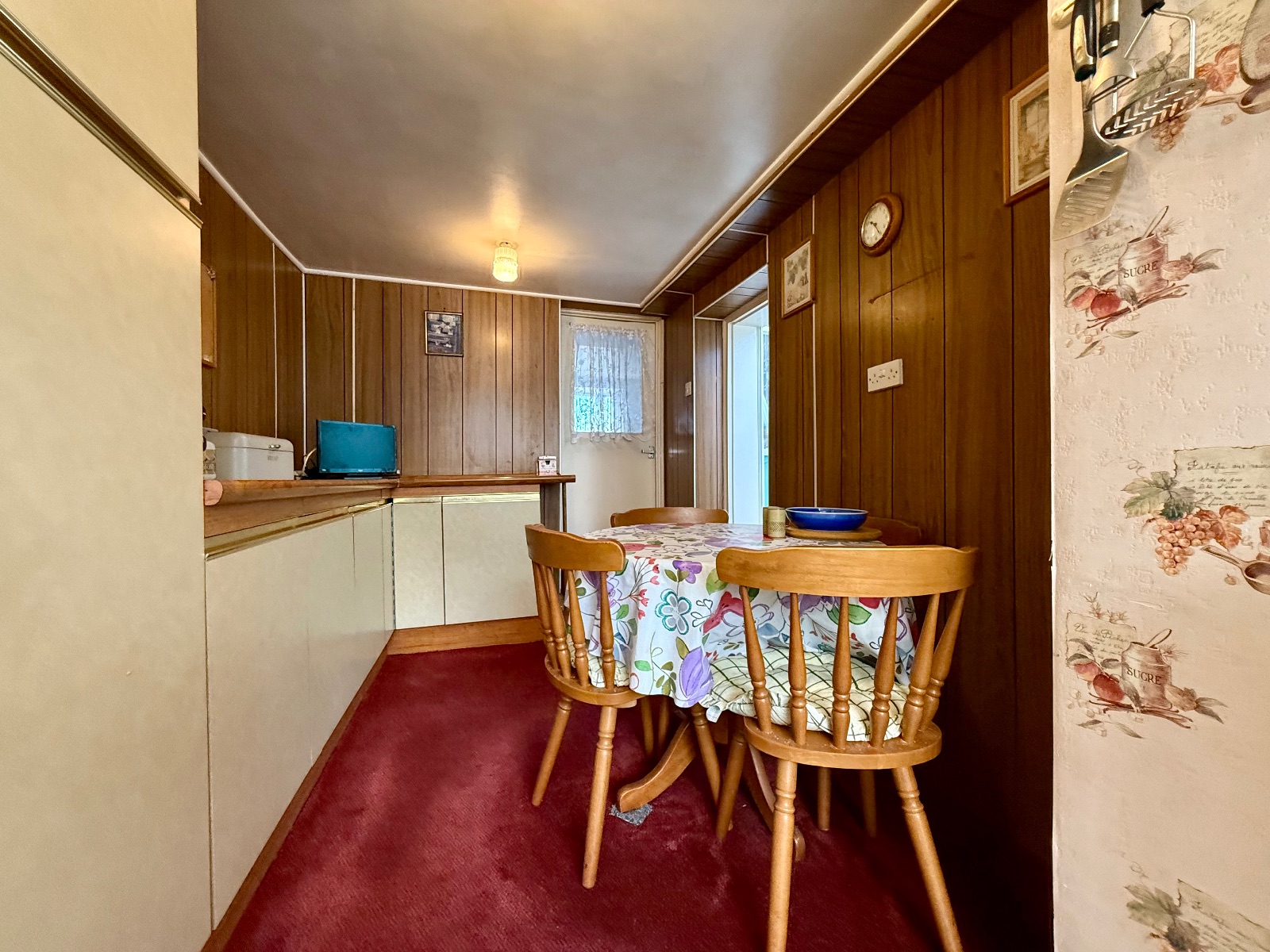 Window to rear, 3 wall units and 10 base units under a timber effect worktop, tiled splash back, space for gas cooker, stainless steel sink and drainer, Worcester combo boiler, part tongue and groove wall panelling, part carpet and cushion flooring, door to:-