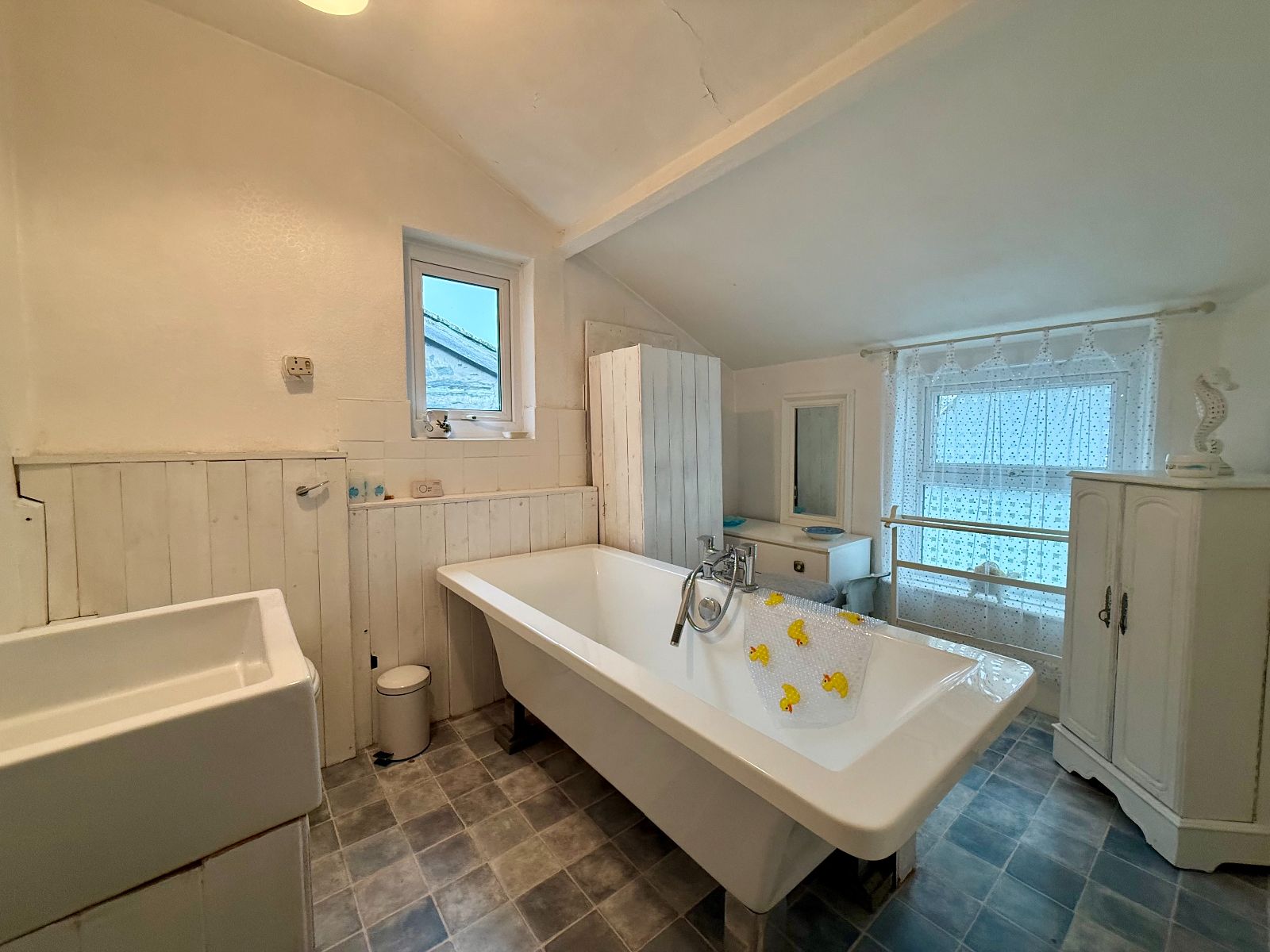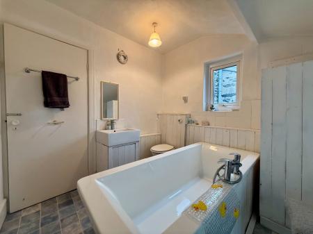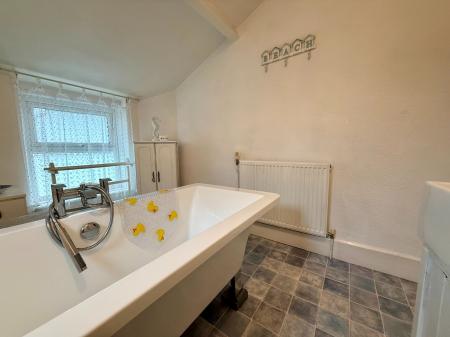 Window to rear, window to side, free standing bath with central taps and shower attachments, vanity wash hand basin, low level W.C., boiler (new), radiator, cushion floor.