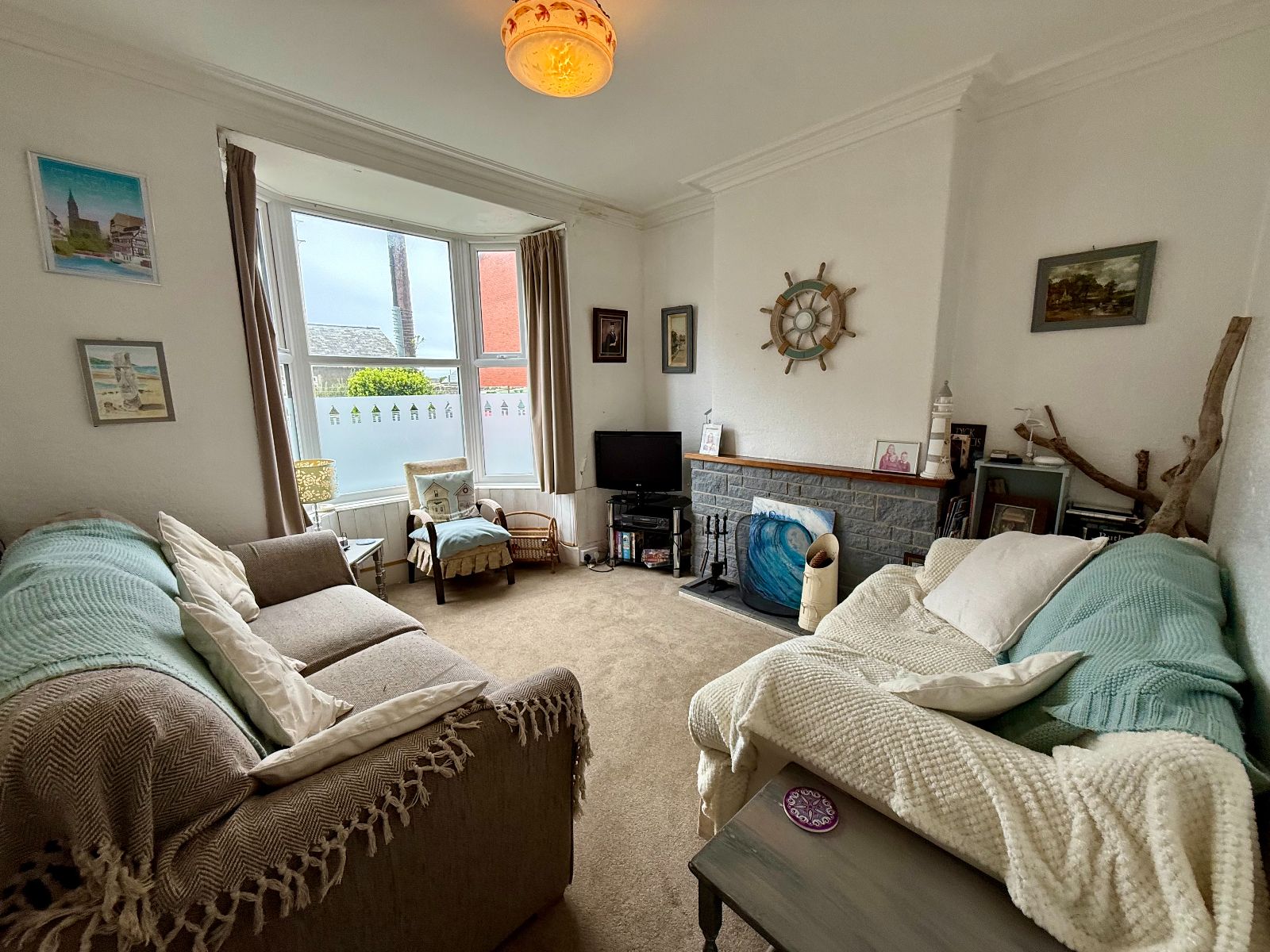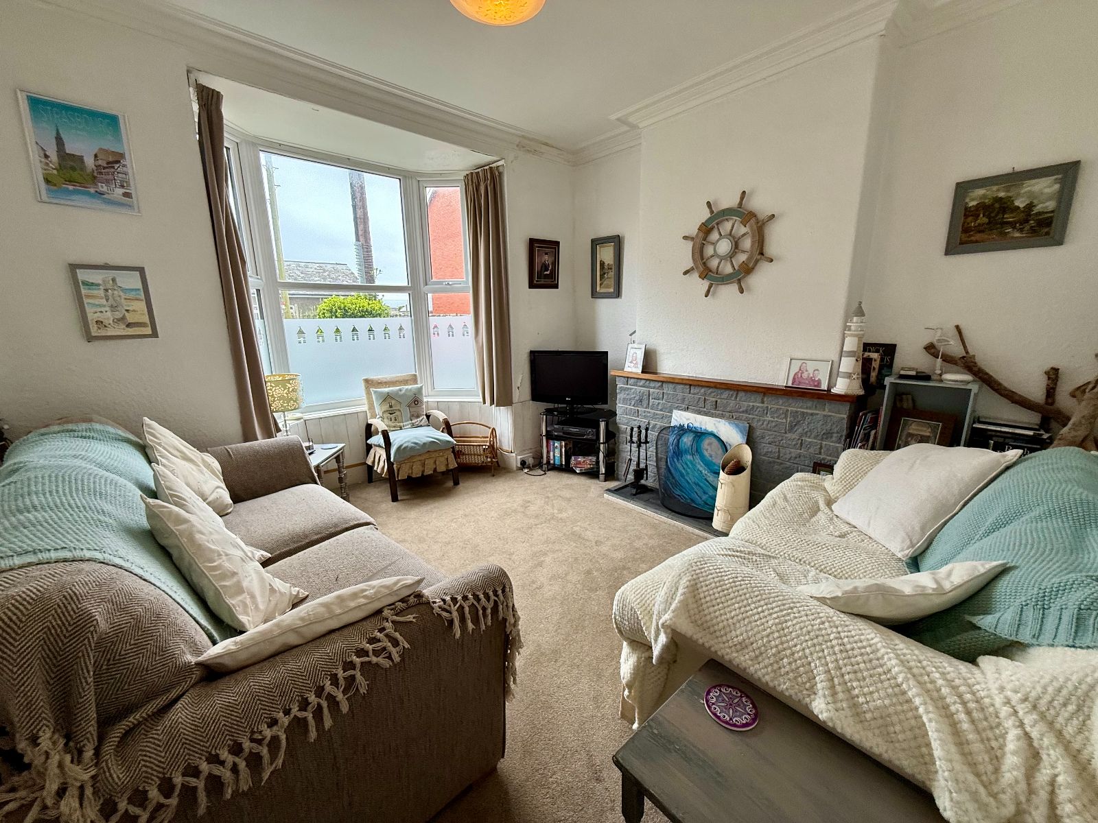 Bay window to front, coved ceiling, brick open fireplace, radiator, carpet.