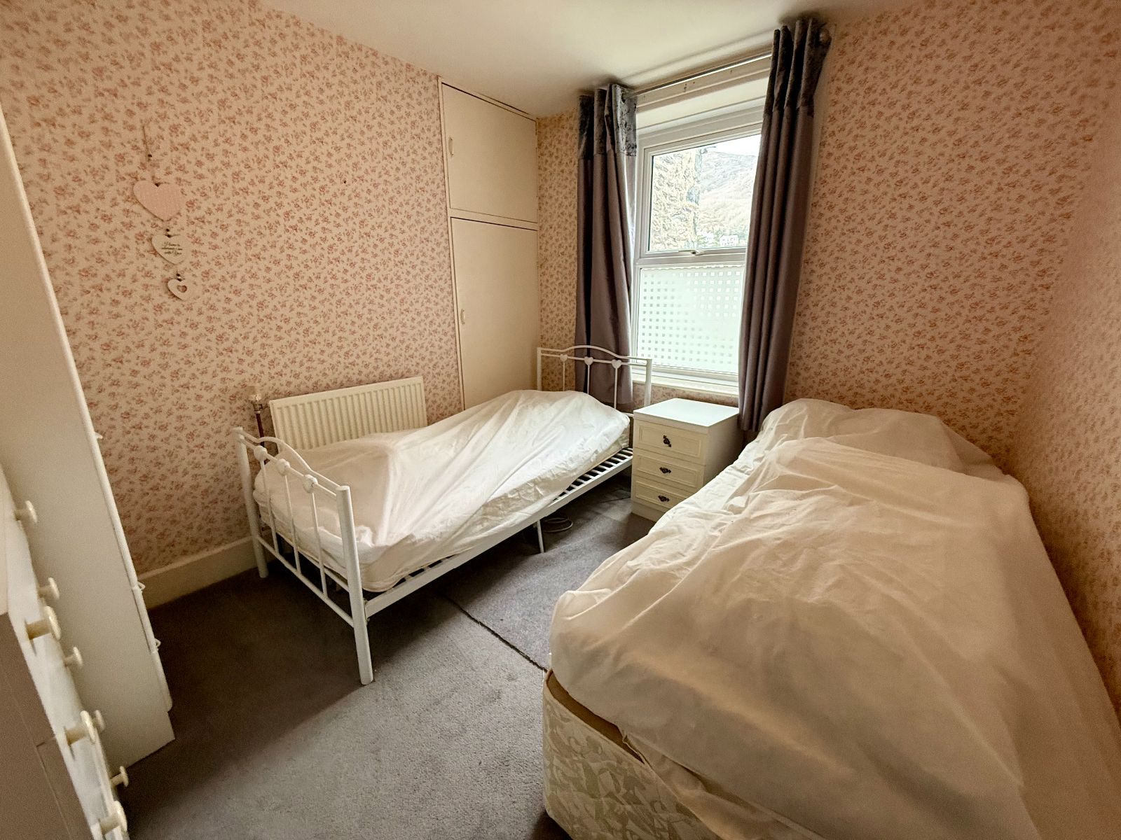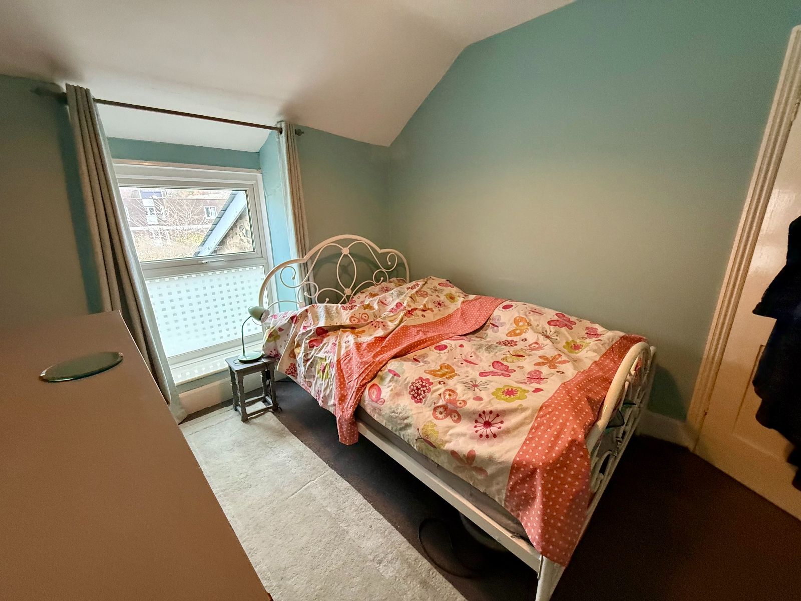 Window to rear with mountain views, built-in wardrobe, radiator, carpet.