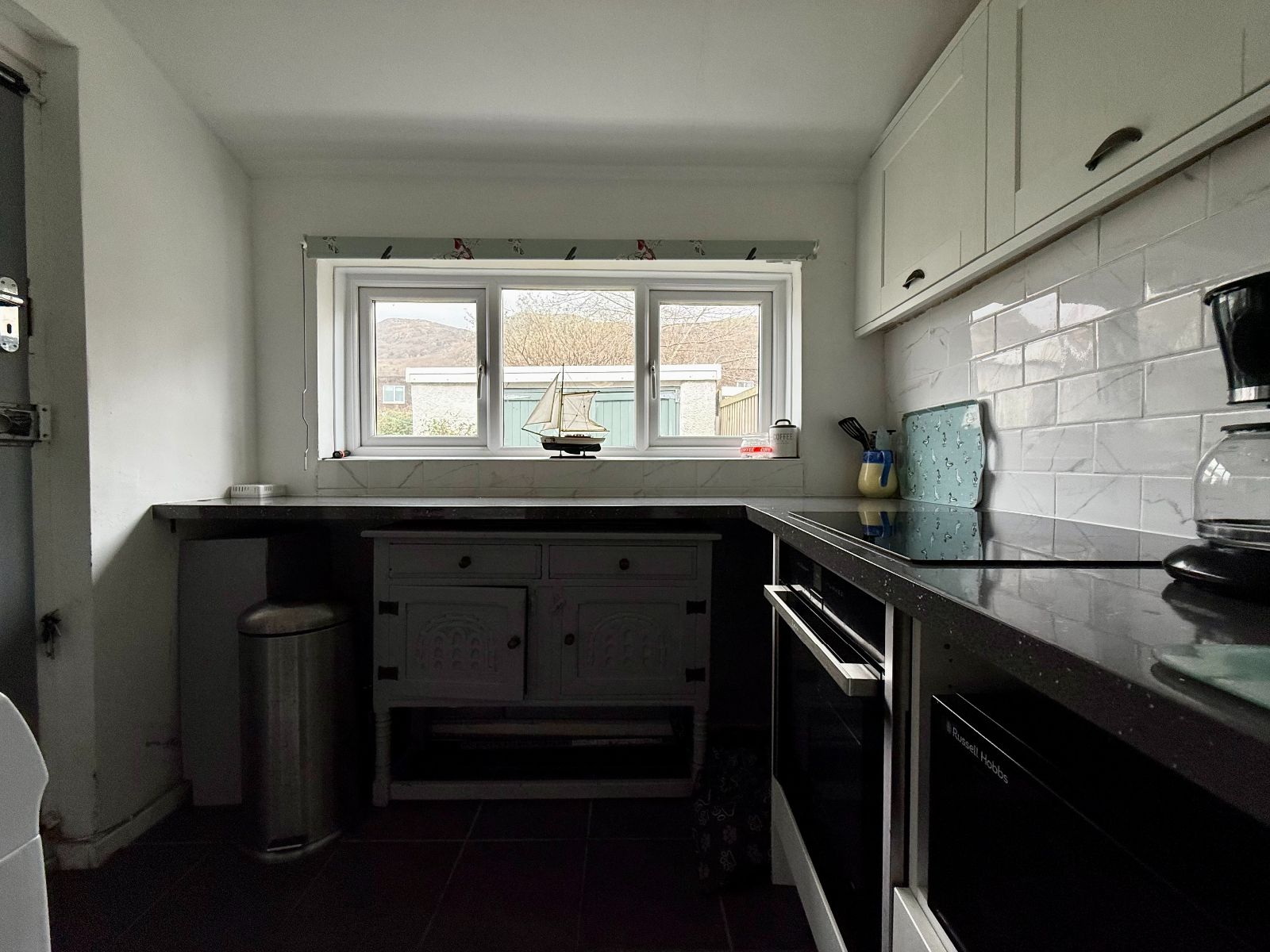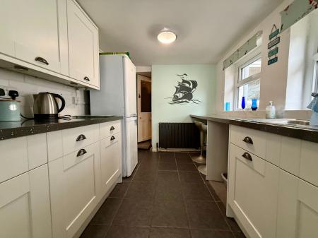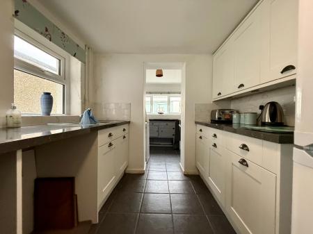 Door to side, 2 windows to side, window to rear, 6 wall units, 6 base units under a granite effect worktops, 1 1/4 stainless steel sink and drainer, space for dishwasher, space for fridge freezer, tiled splash backs, integral NEFF pyrolytic cooker, 4 ring ceramic hob, space and plumbing for washing machine, radiator, tiled floor.