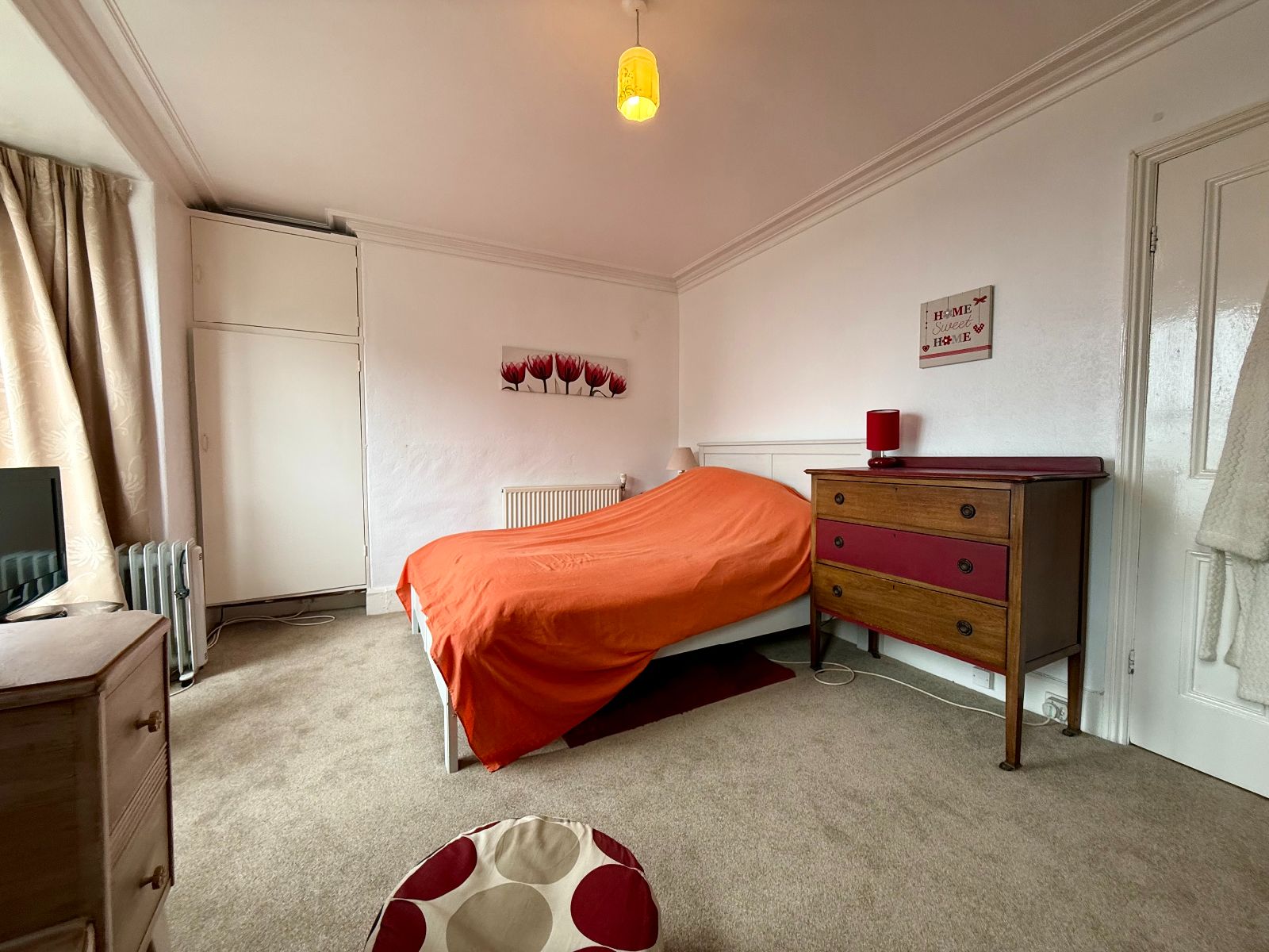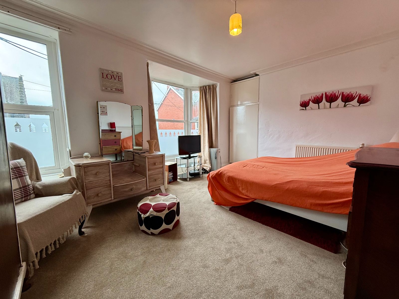 Bay window to front, window to front, coved ceiling, built-in wardrobe, radiator, carpet.