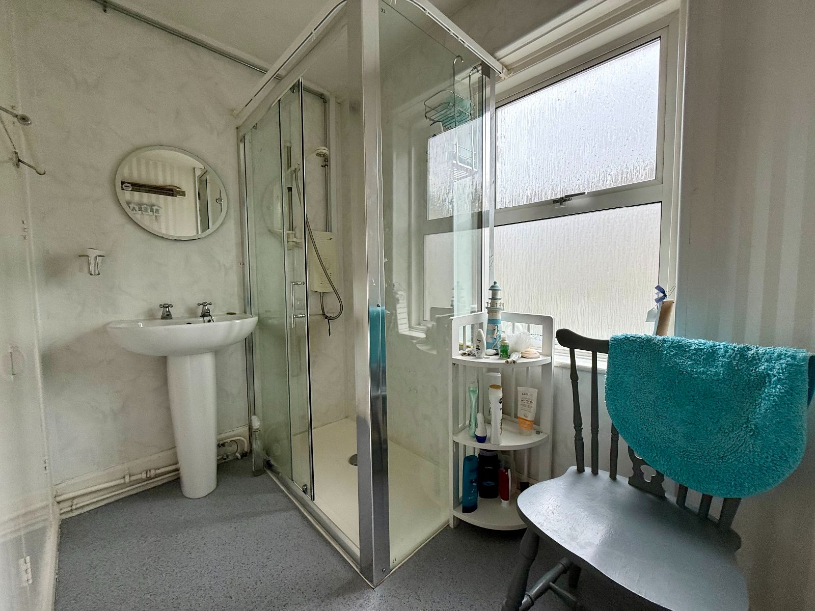Window to rear, large shower cubicle with wet wall paneling and electric shower, pedestal wash hand basin, electric wall heater, radiator, non-slip floor.