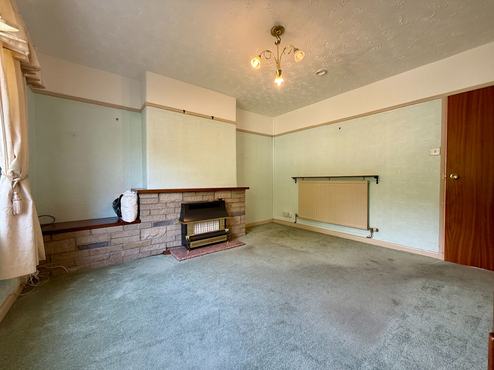 Window to rear, picture rail, stone/brick faced fireplace housing gas fire on arable hearth, radiator, carpet.
