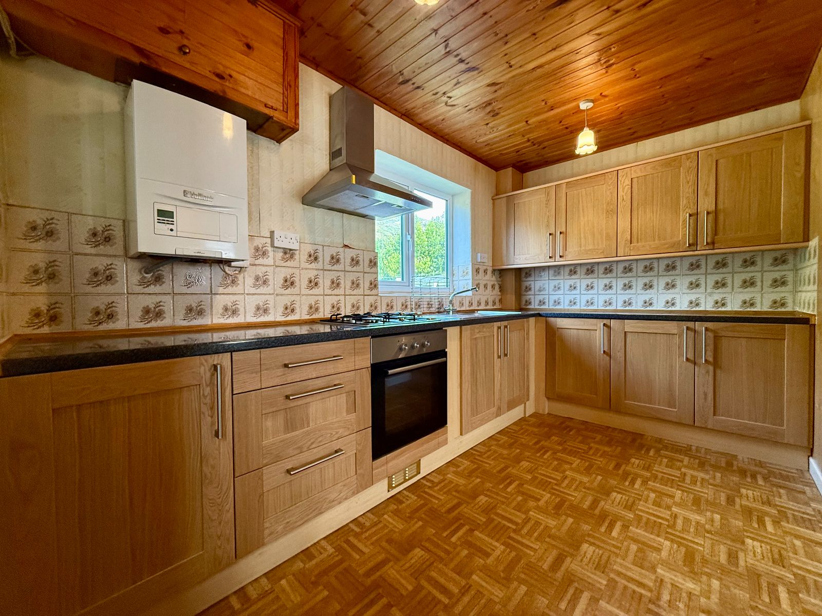 Window to rear, 4x wall units, 7x base units under a granite effect worktop, tiled splash backs, stainless steel sink and drainer, integral oven , 4 ring gas hob with extractor hood above, tounge and grove ceiling, cushion flooring.
