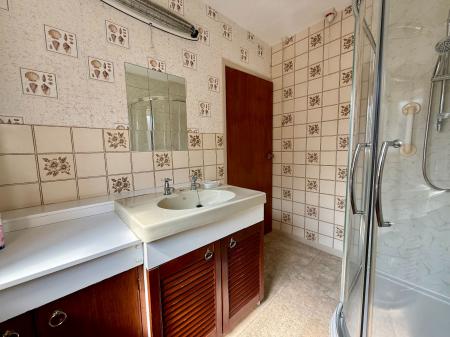 Window to front, large shower with wet wall paneling, electric shower, vanity wash hand basin, mirror, electric heater, comfort height W.C., cushion flooring.