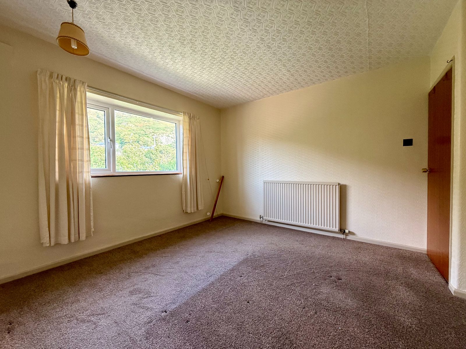 Window to rear with mountain views, radiator, carpet.