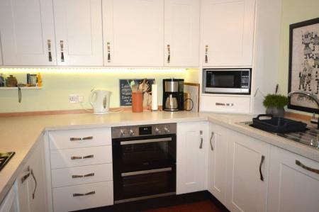 Patio doors to front with slate step, fully fitted kitchen to include; 7x wall units, 8x base units under a granite effect worktop, integral oven, integral fridge, integral dishwasher, space for hidden washing machine, space for freezer, gas hob. stainless steel sink and drainer, quarry tiles with under floor heating.