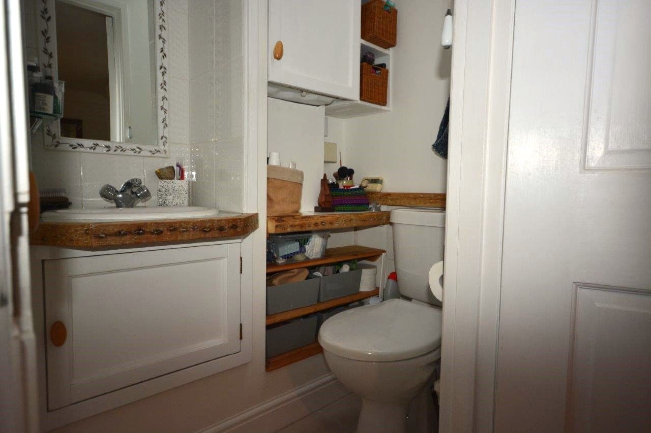 Velux to front, built in wash hand basin alcove, W.C., built in shelving, built-in wardrobe and cupboard above, part tiled walls, tiled flooring.