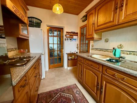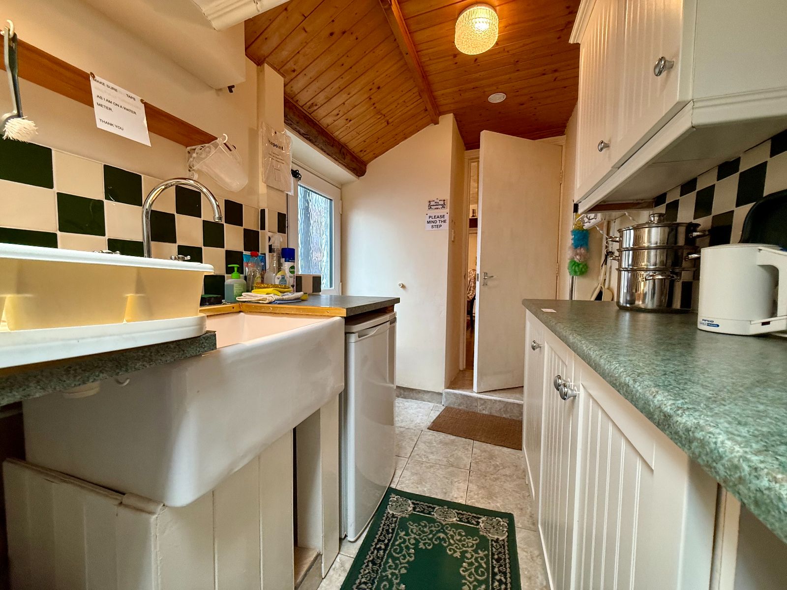Window to rear, tongue and groove ceiling, 8 wall units and 8 base units under a granite effect worktop, tiled splashback, integrated electric hob, extractor hood over, integrated eye level oven, 1 1/4 stainless steel sink and drainer, plumbing for washing machine, radiator, airing cupboard housing immersion heater, space for fridge/freezer, cushion flooring.