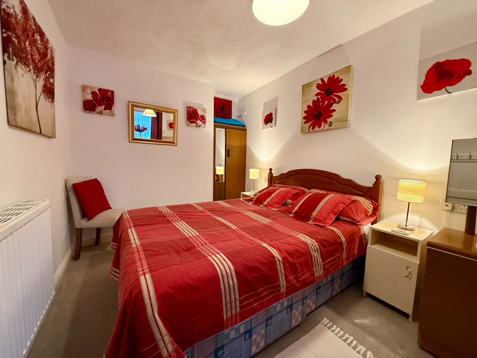 Window to side, cupboard housing electric meter, built in wardrobe, radiator, carpet.