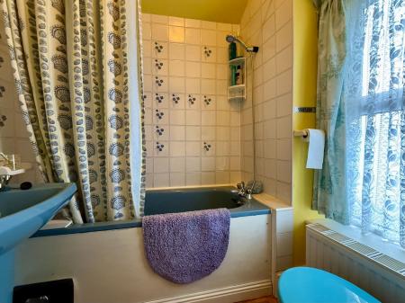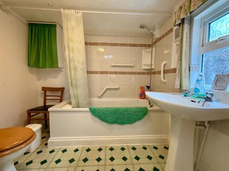 Window to side, part tiled walls, low level W.C. , wash hand basin, bath with mixer shower over, radiator, cushion flooring.