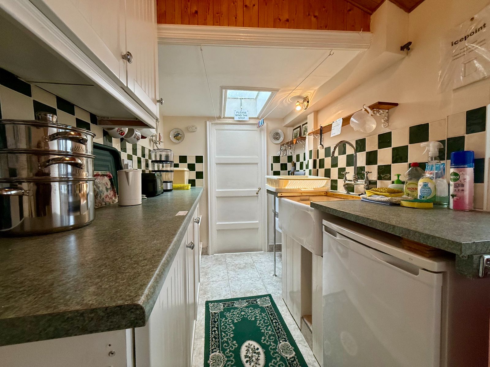 Window to side, door to side leading into the courtyard, skylight window, 2 wall units and 3 base units under a marble effect worktop, Belfast sink, tiled splashback, 'Vaillant' boiler, tiled flooring.