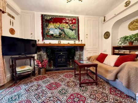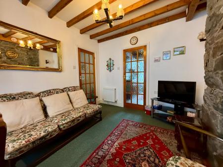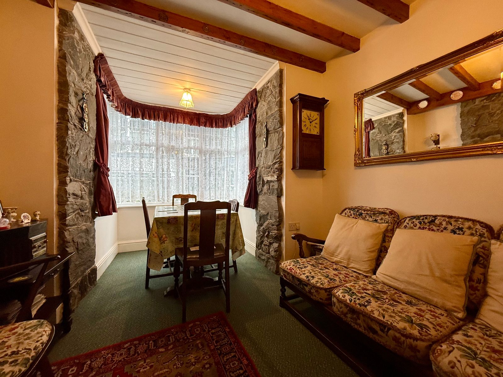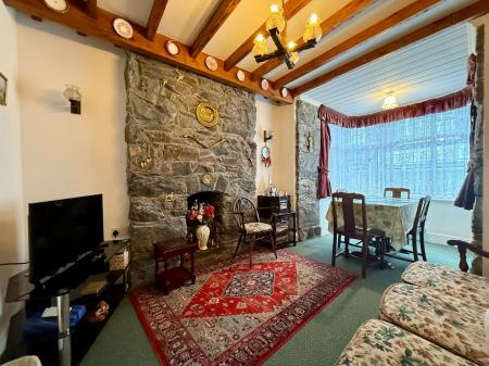Bay window to front, beamed ceiling, feature stone fireplace, part exposed stone walls, 2 radiators, carpet. Door leading to:-
