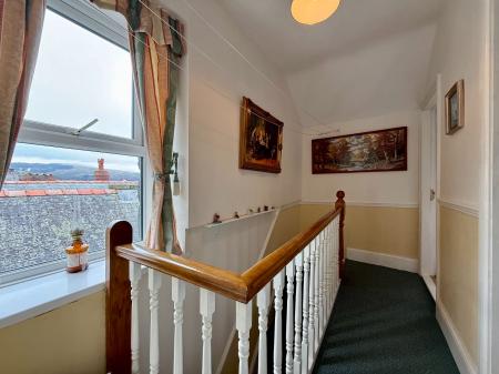 Window to rear with distant sea views, dado rail, carpet, stairs to second floor landing.