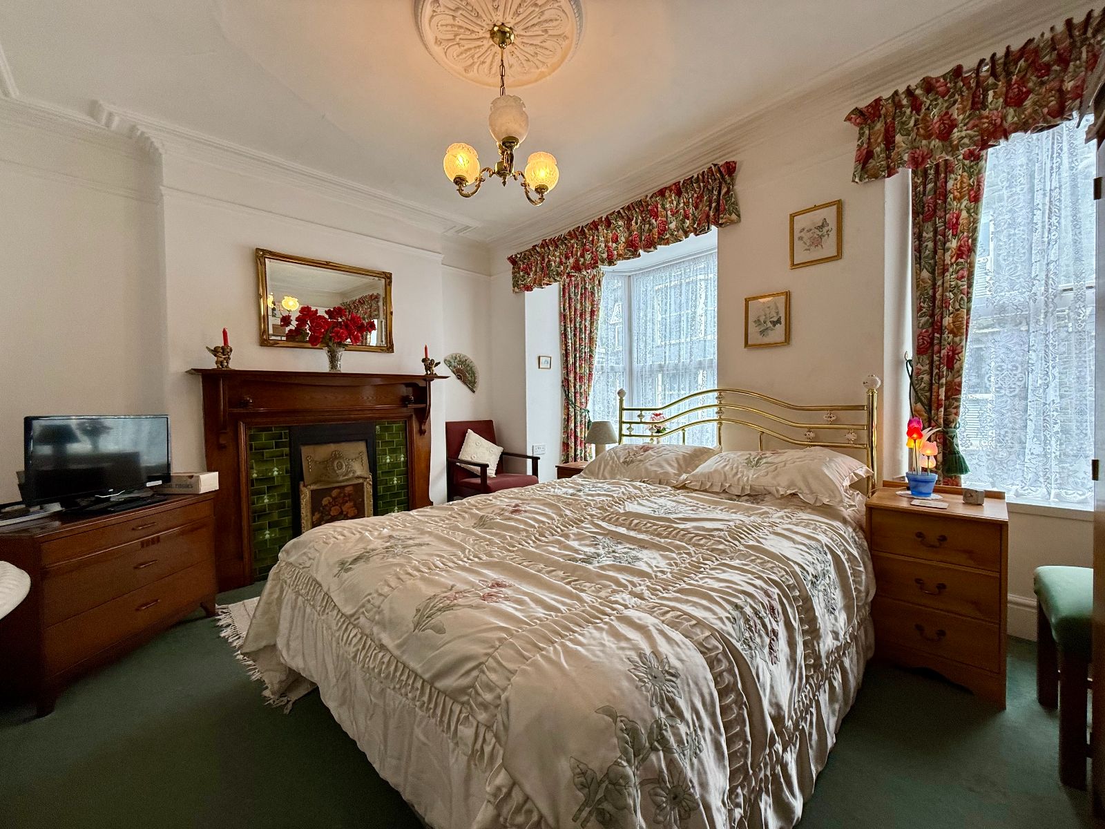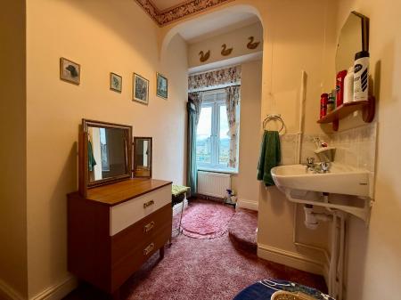 Two windows to front, one being a large bay window, period feature fireplace with wooden surround and tiled inserts, decorative cornicing, ceiling rose, picture rail, radiator, wash hand basin, carpet.