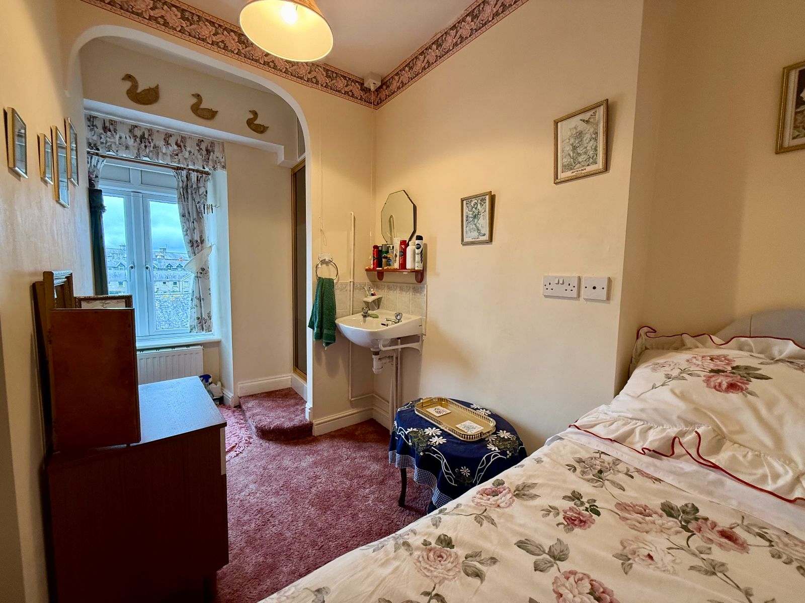 Window to rear with distant sea view, radiator, shower cubicle with tiled enclosure and electric shower, wash hand basin, radiator, carpet.