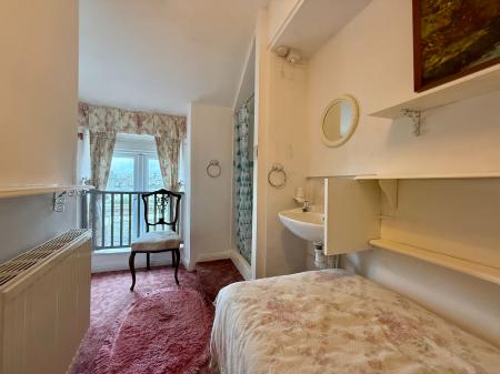 Window to rear with distant sea views, tiled shower enclosure with electric shower, wash hand basin, radiator, carpet.