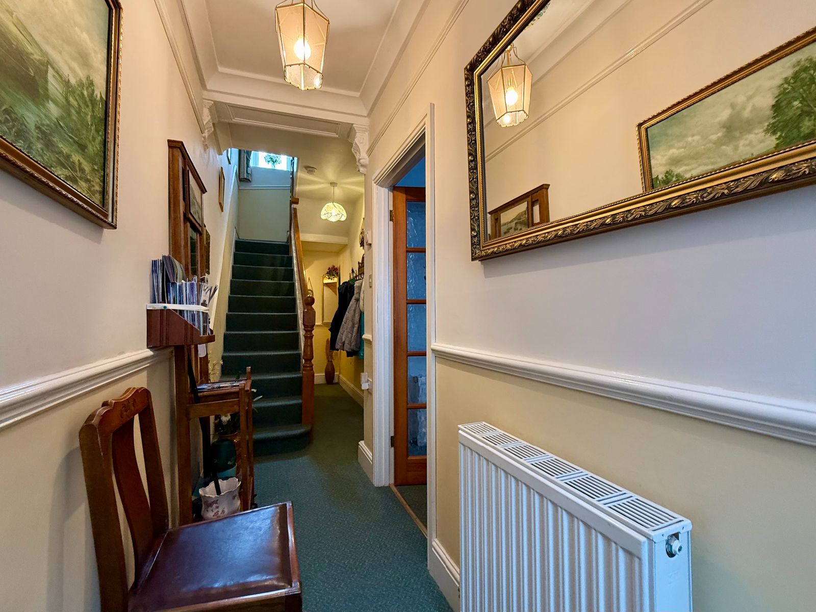 Door to front, coved ceiling, picture rail, dado rail, radiator, stairs to lower ground floor, carpet.