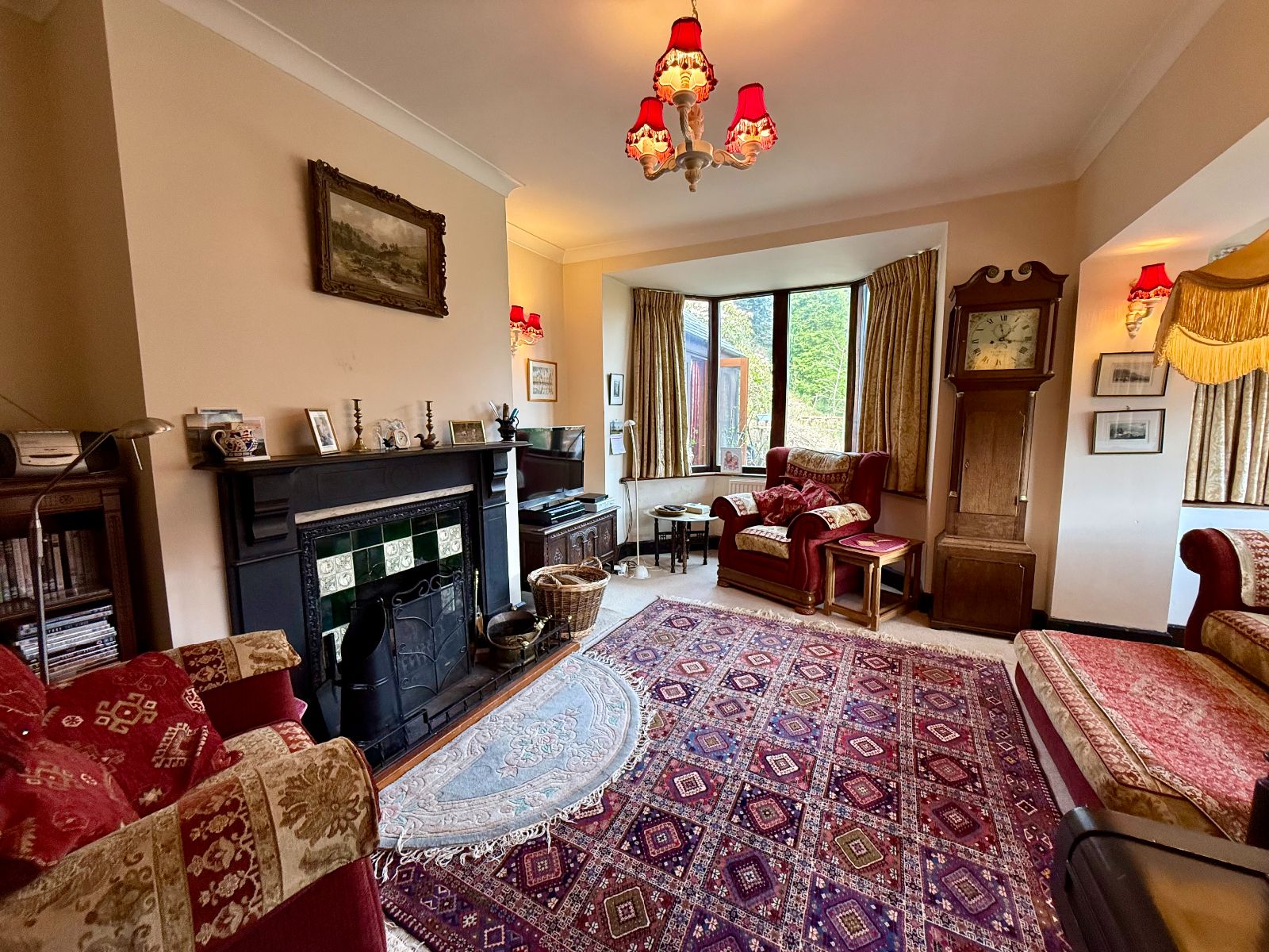 Bay window to front and side, coved ceiling, open feature fireplace with slate surround, tiled inset on a slate hearth, 2 radiators, carpet.