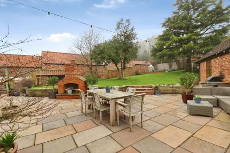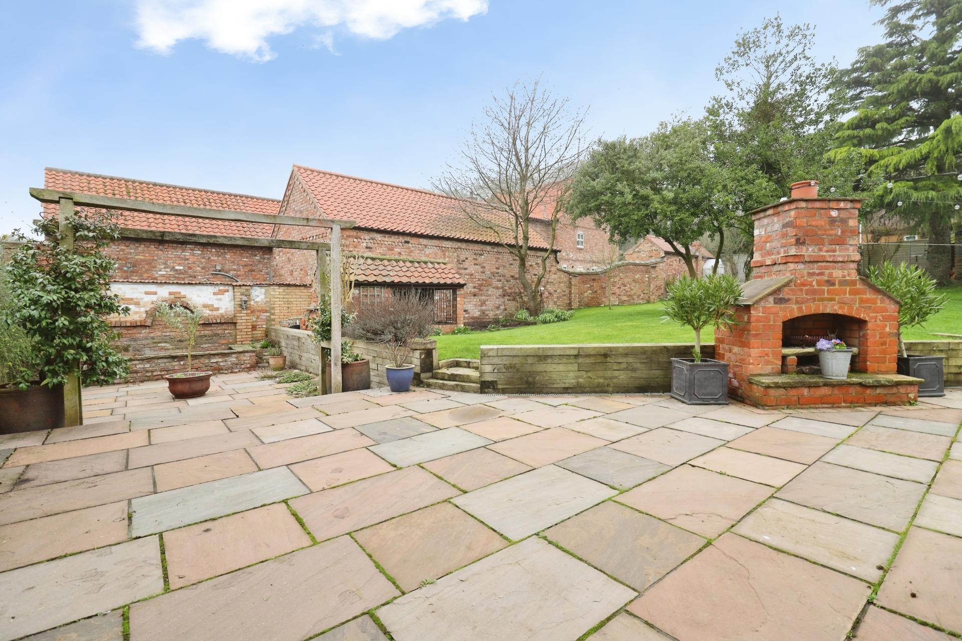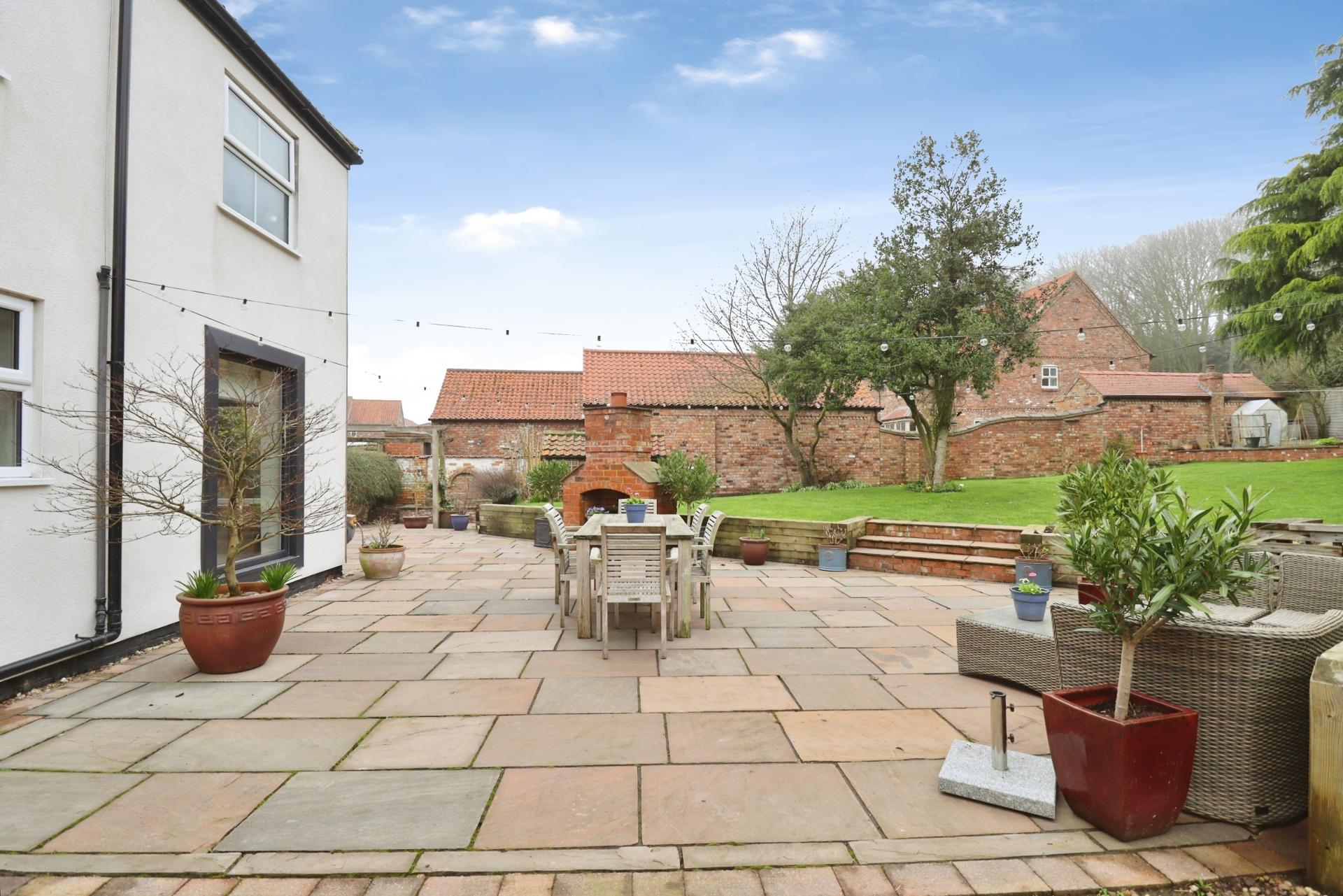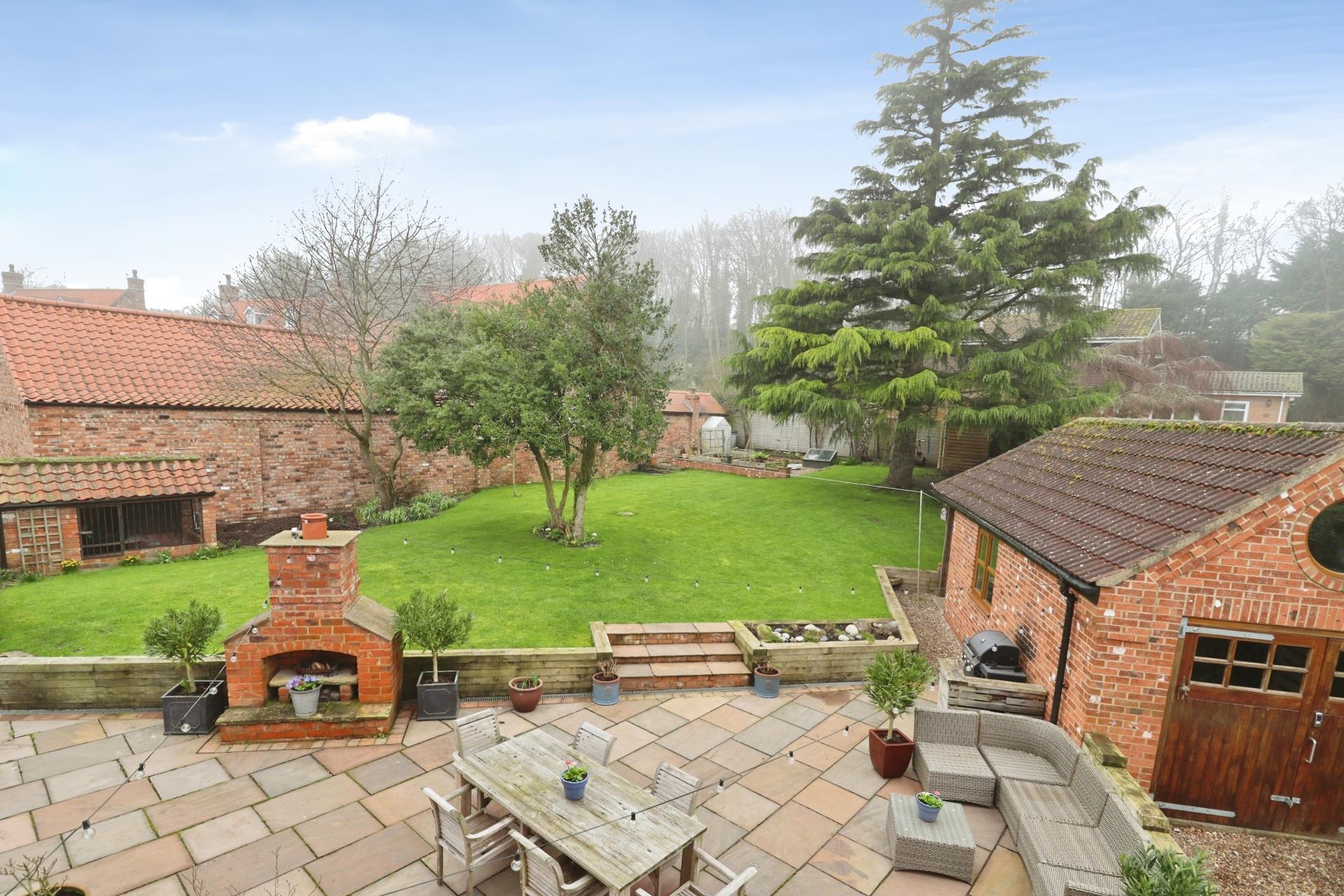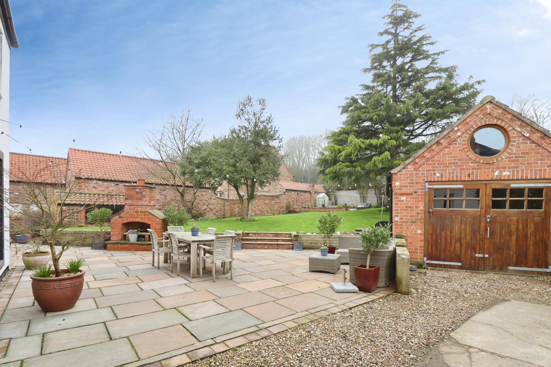 - Mature gardens with multiple seating areas and fire pit