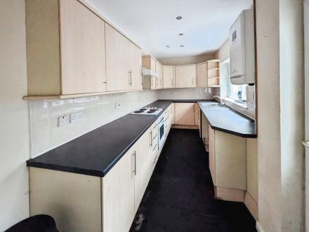 Fitted kitchen. Vinyl flooring. Range of wall and base units. Integrated electric oven and hob with extractor hood. Stainless steel sink. Gas combi boiler. Plumbing for washing machine. Double glazed window to rear.