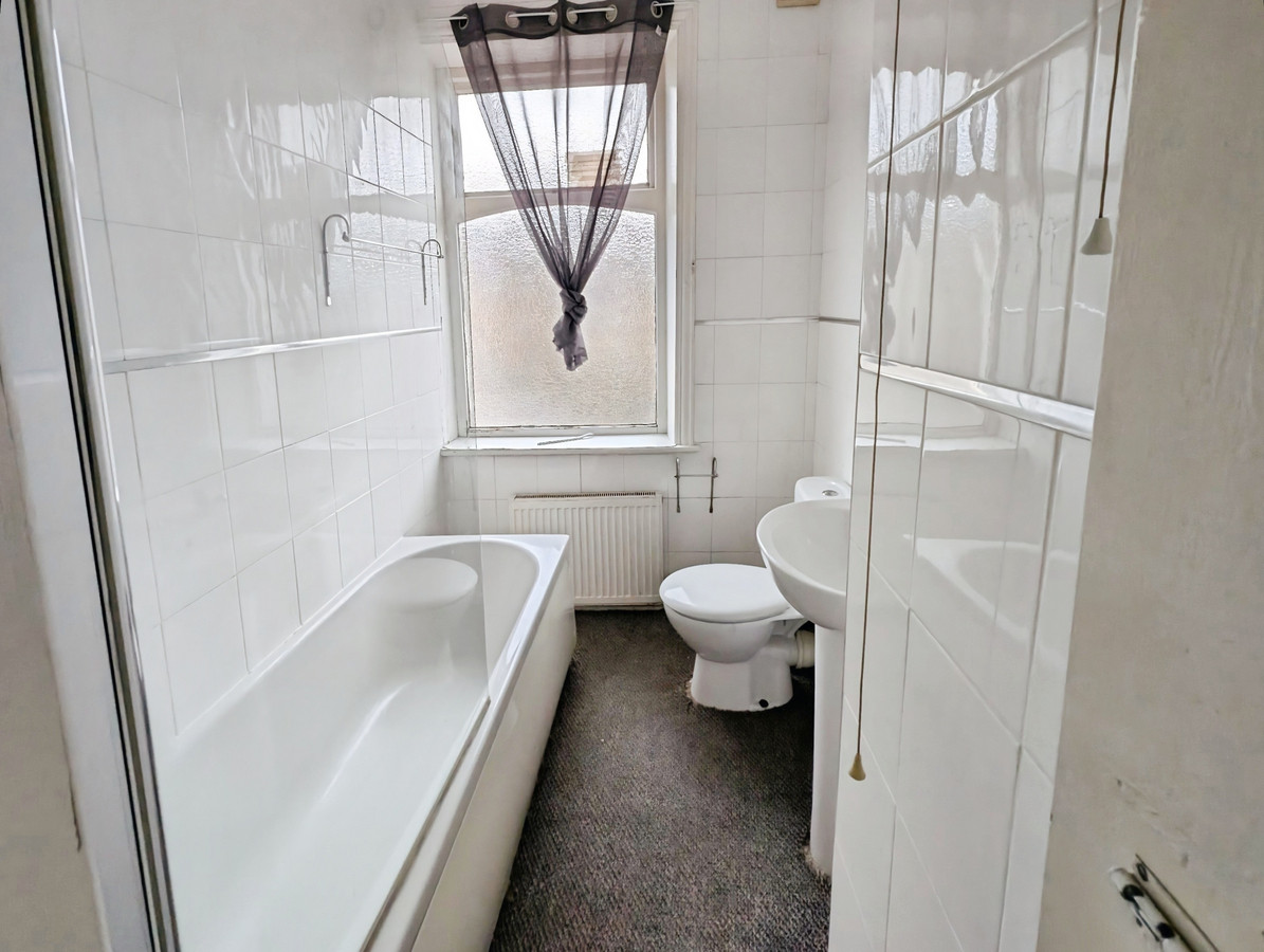 Bath with electric shower over, WC. Washbasin. Radiator. Frosted window to rear.