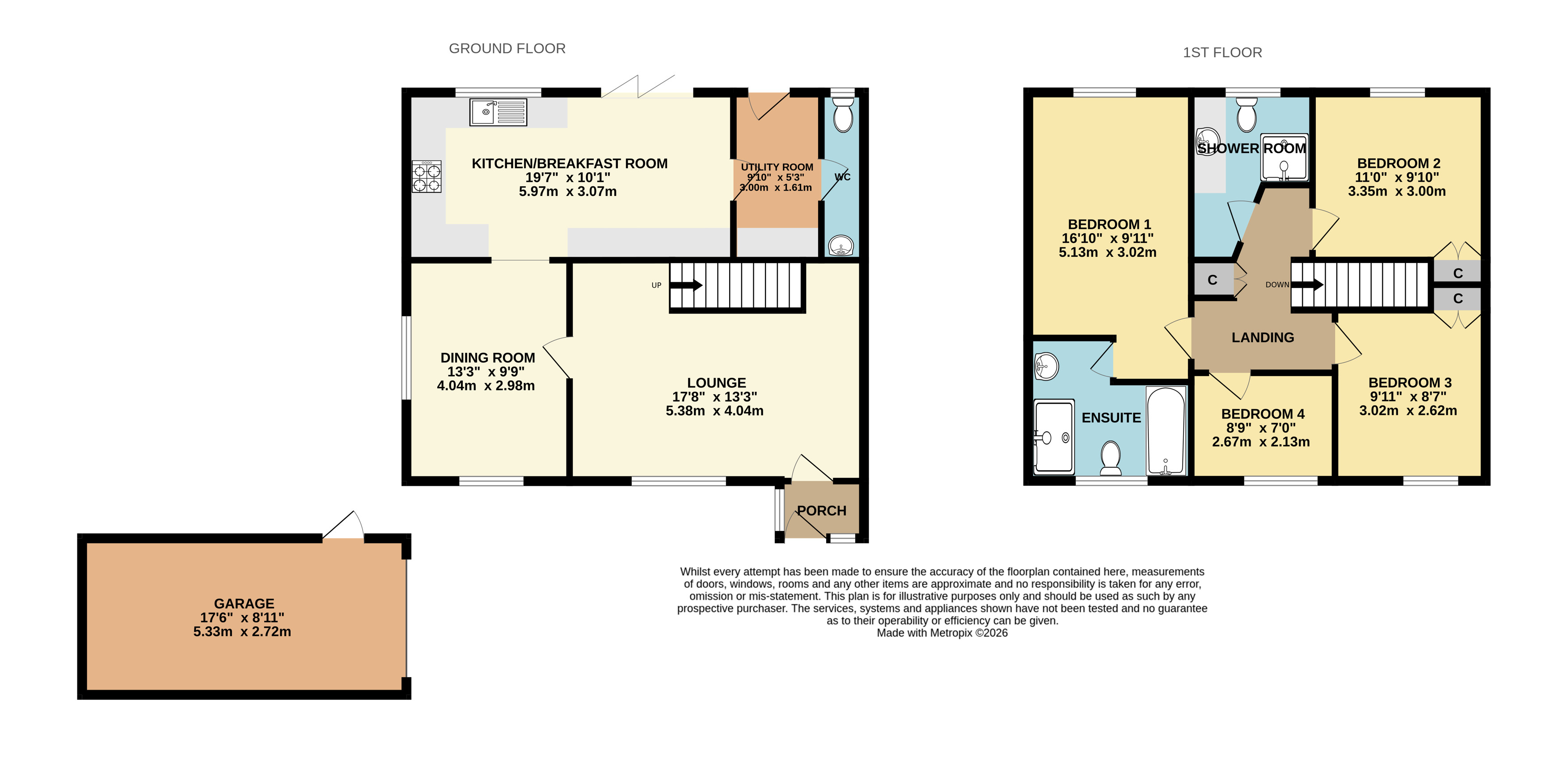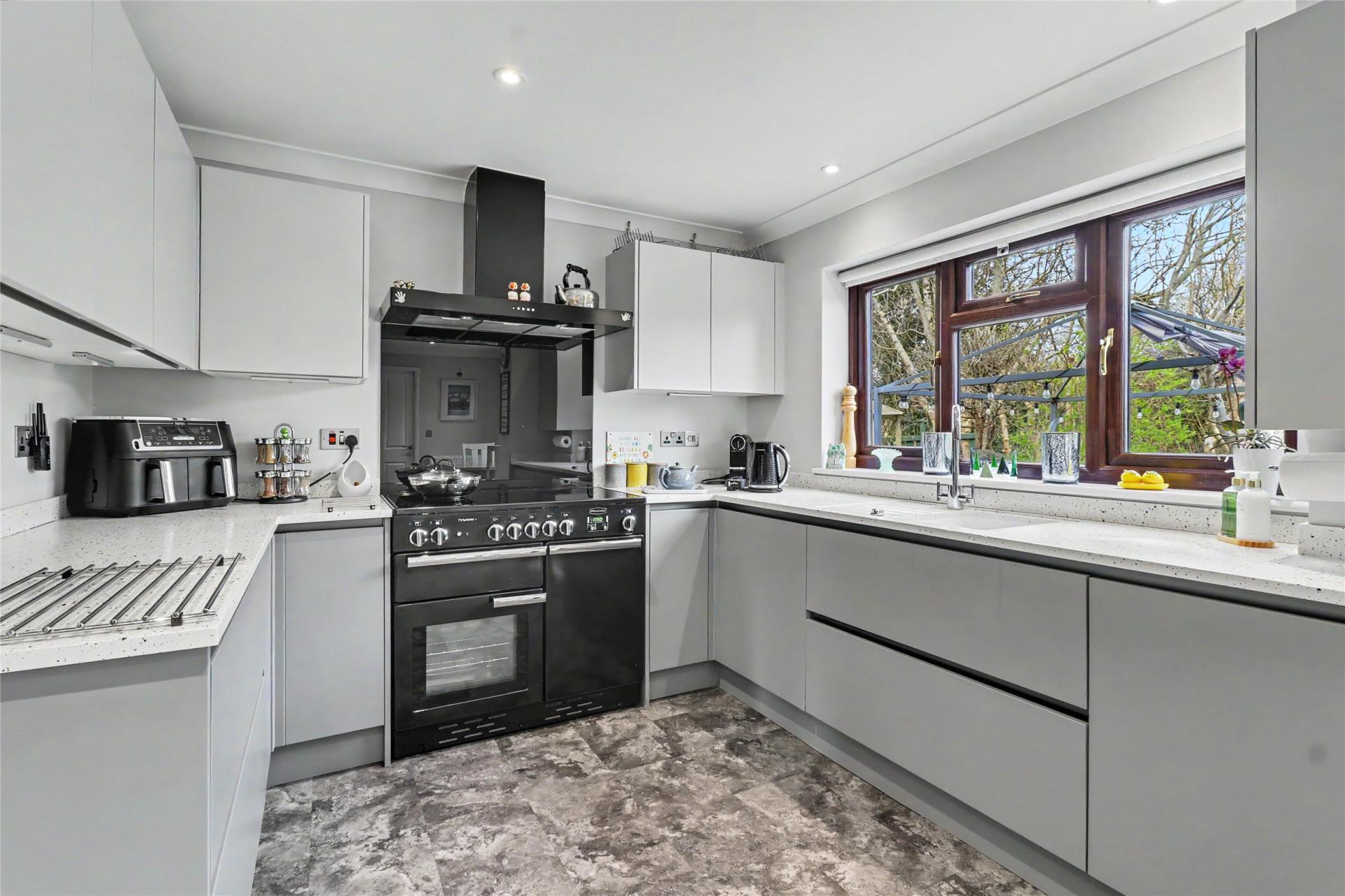 The property is entered via a practical porch with space for coats and shoes, leading into a generous lounge with a front aspect window and stairs rising to the first floor. A door from the lounge leads through to a good-sized dining room with dual aspect windows, creating a bright and welcoming second reception space. From here, you access the kitchen/breakfast room, which is fitted with modern, contemporary units, a rangemaster oven, and intergrated dishwasher, with a window overlooking the rear garden. The kitchen extends into a breakfast area with space for a table and French doors opening onto the garden. To the rear, there is also a utility room, a downstairs WC, and further access out to the garden.