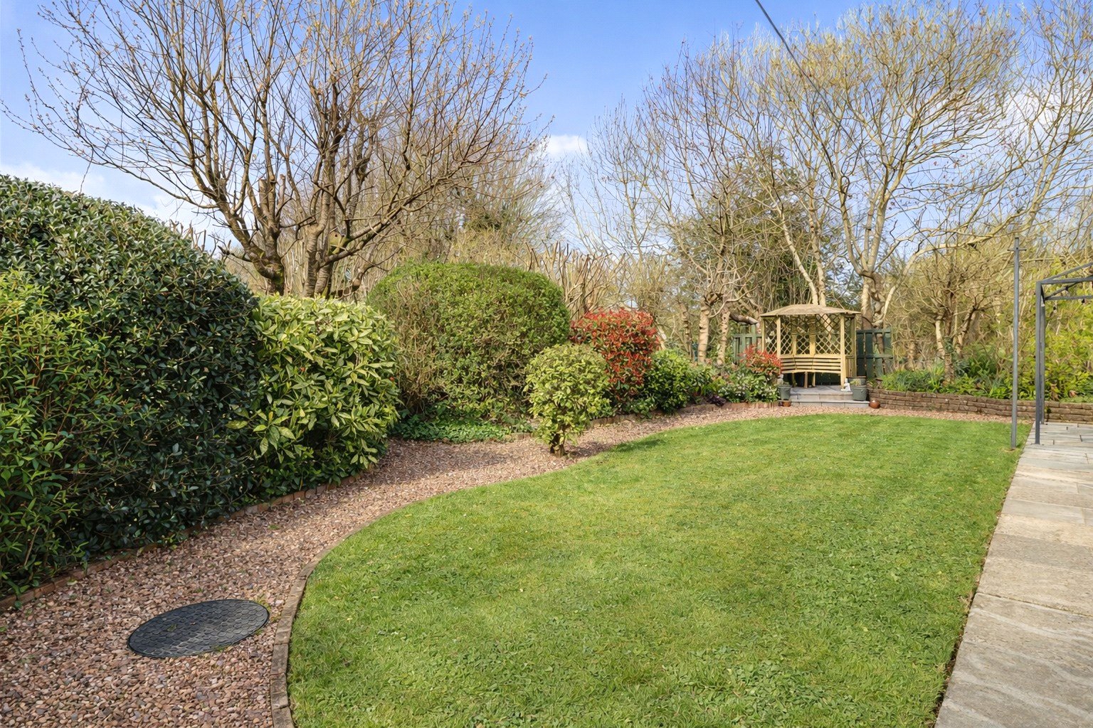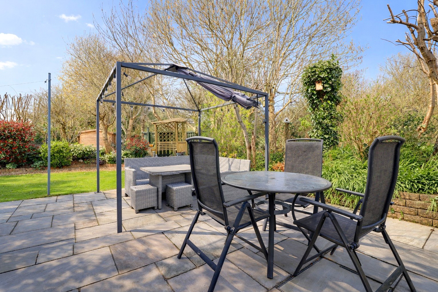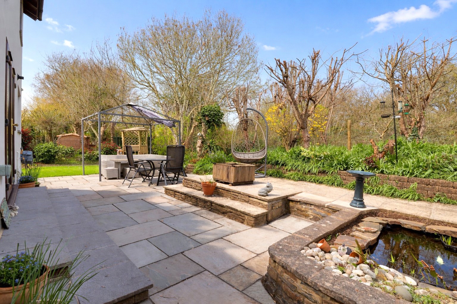 Externally, the rear garden enjoys views over nearby fields and provides a mix of seating areas and lawn, ideal for outdoor dining.
