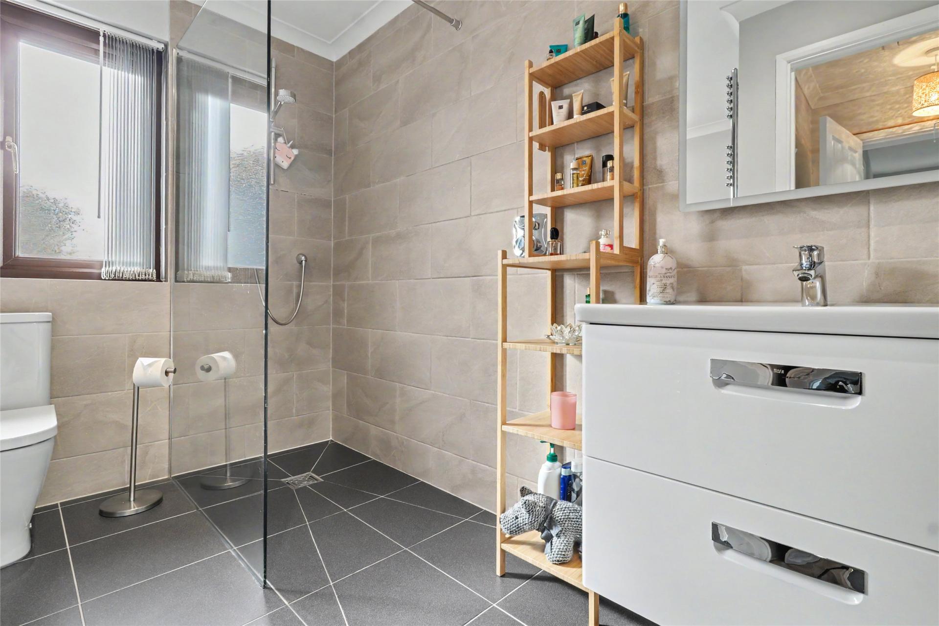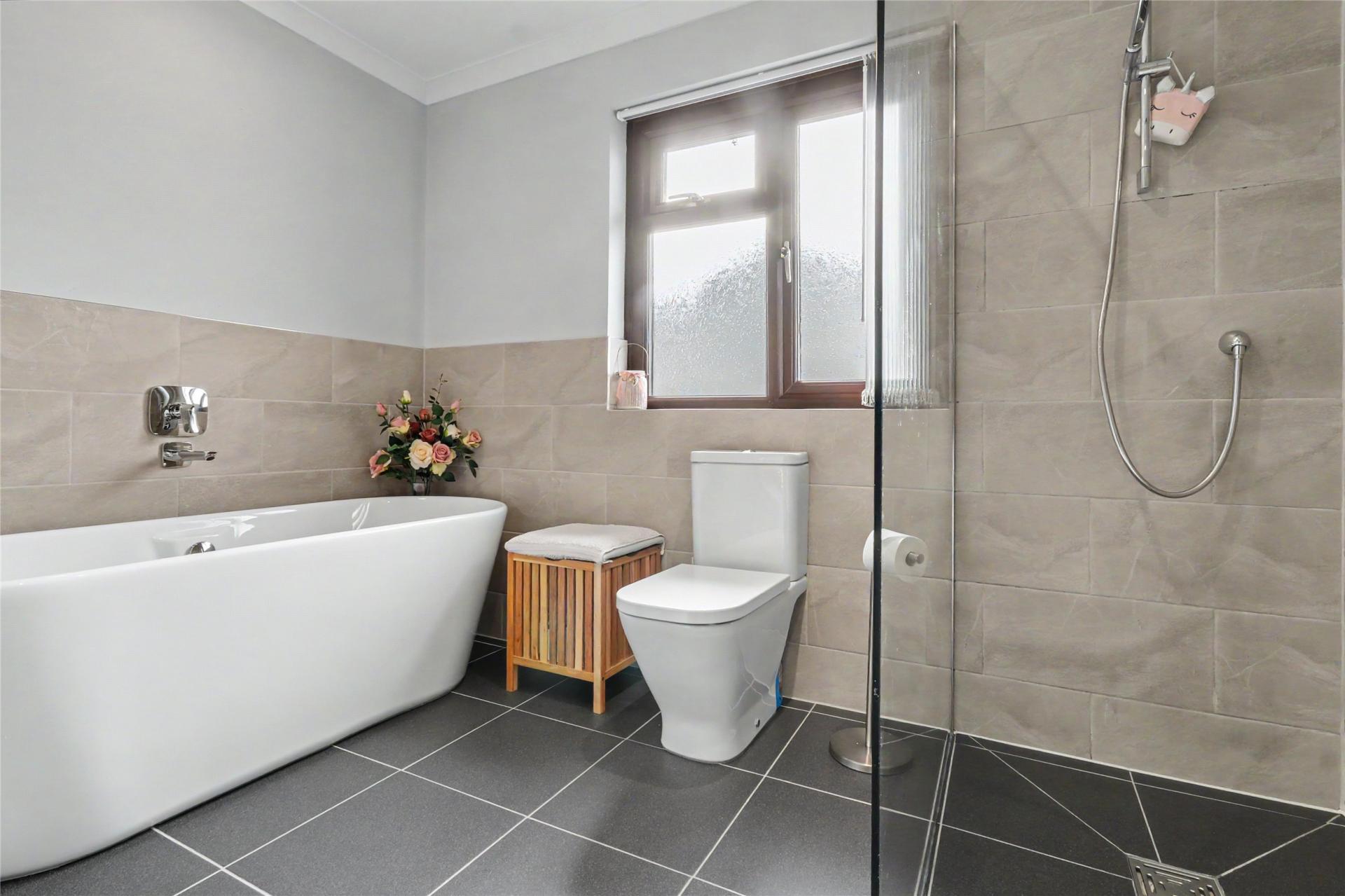 Upstairs, the property offers three double bedrooms, including a particularly spacious principal bedroom with an en suite featuring a walk-in shower, freestanding bath, WC and basin. There is also a fourth single bedroom and a modern family shower room, all presented in excellent order.
