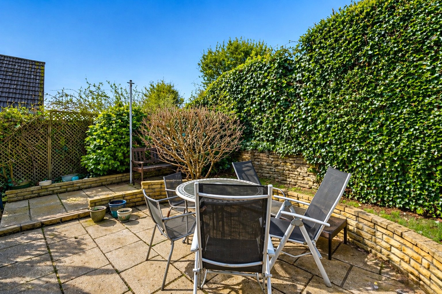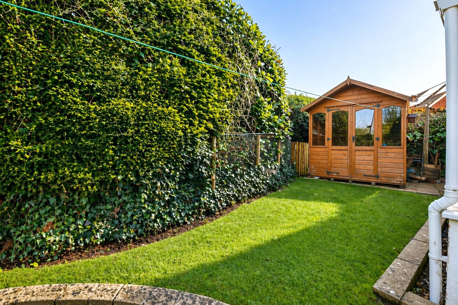 Externally, the property features a driveway providing off-road parking, a large garage with an electric up-and-over door, and steps leading to the front entrance and garden, with side pedestrian access to the rear. The rear garden is private and south-facing, bordered by mature shrubs and hedging, and includes a summerhouse—ideal for outdoor dining, relaxation, and entertaining.