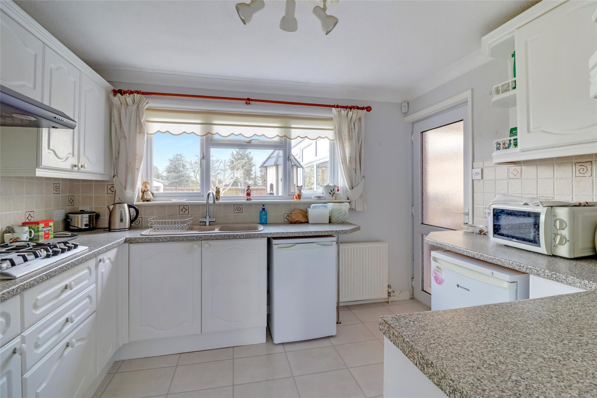 The fitted kitchen features a range of wall and base units complemented by work surfaces, an integrated oven and gas hob, and space for appliances. The kitchen further benefits from a pleasant outlook over the rear garden.