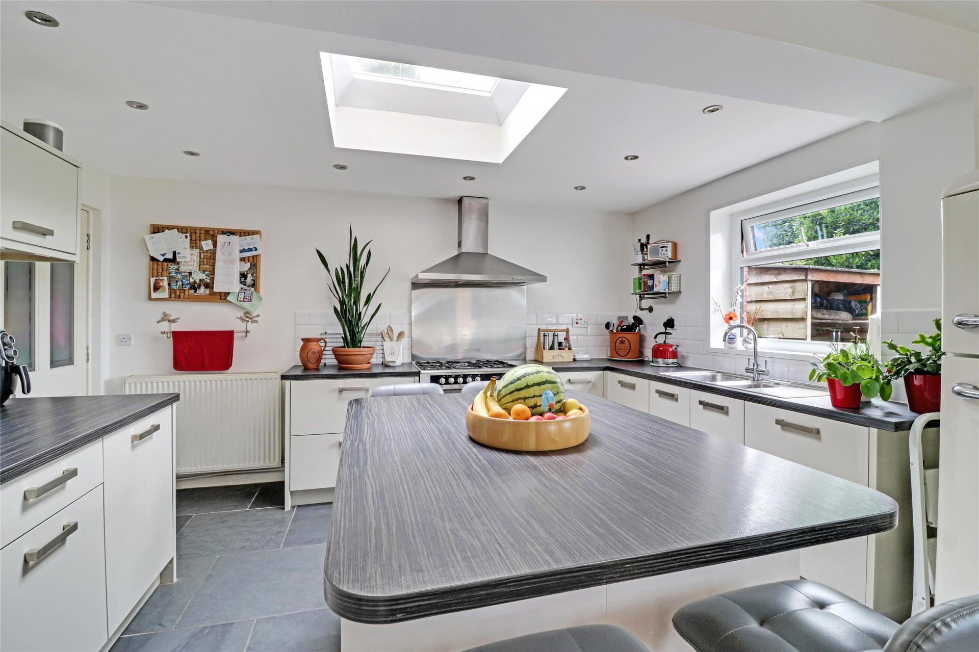 Moving towards the rear, you arrive at the heart of the home  a beautifully presented open-plan kitchen and dining area. Updated within the past decade, this space has been designed with both style and practicality in mind, featuring a substantial central island that serves as the perfect hub for family life and social gatherings. From here, a door leads into a well-organised boot room, providing access to a convenient downstairs shower room and also into the garage, making day-to-day living both easy and efficient.