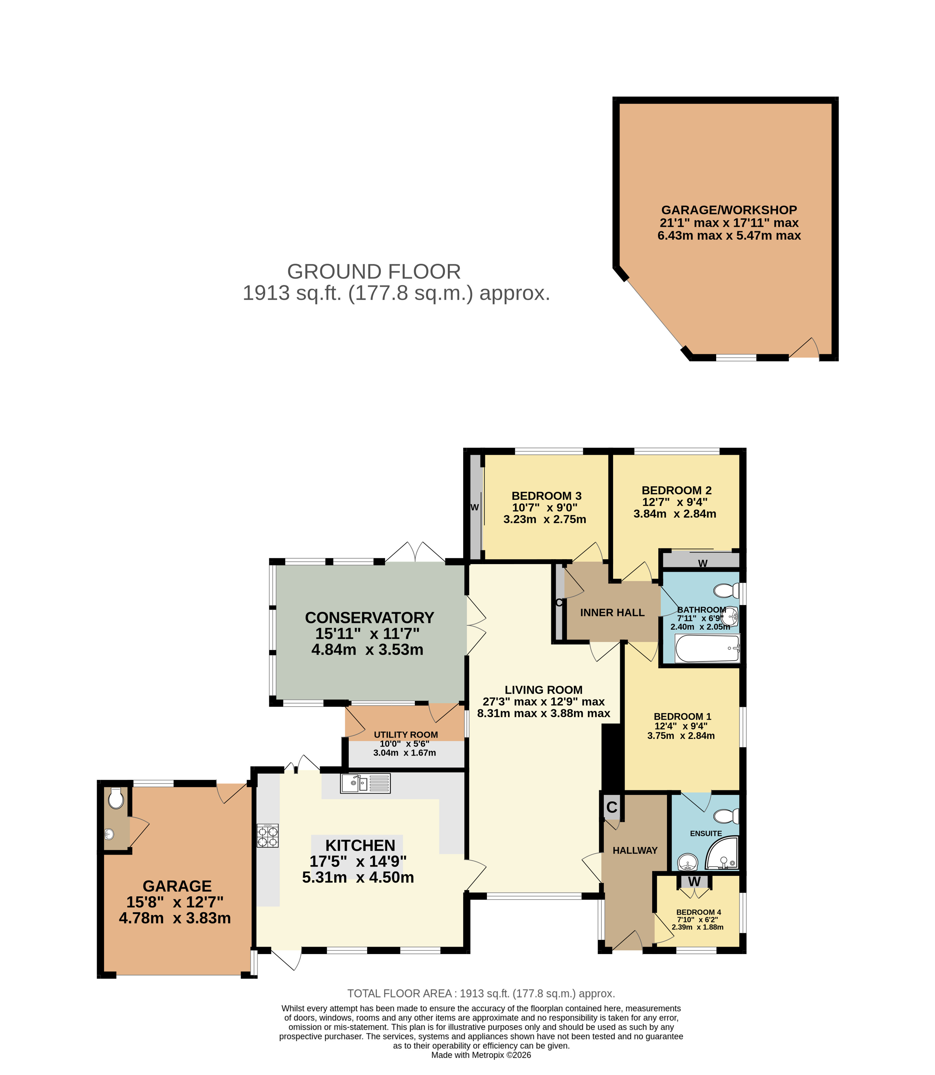 Garage/Workshop 21'1" (6.43m) max x 17'11" (5.46m) max.