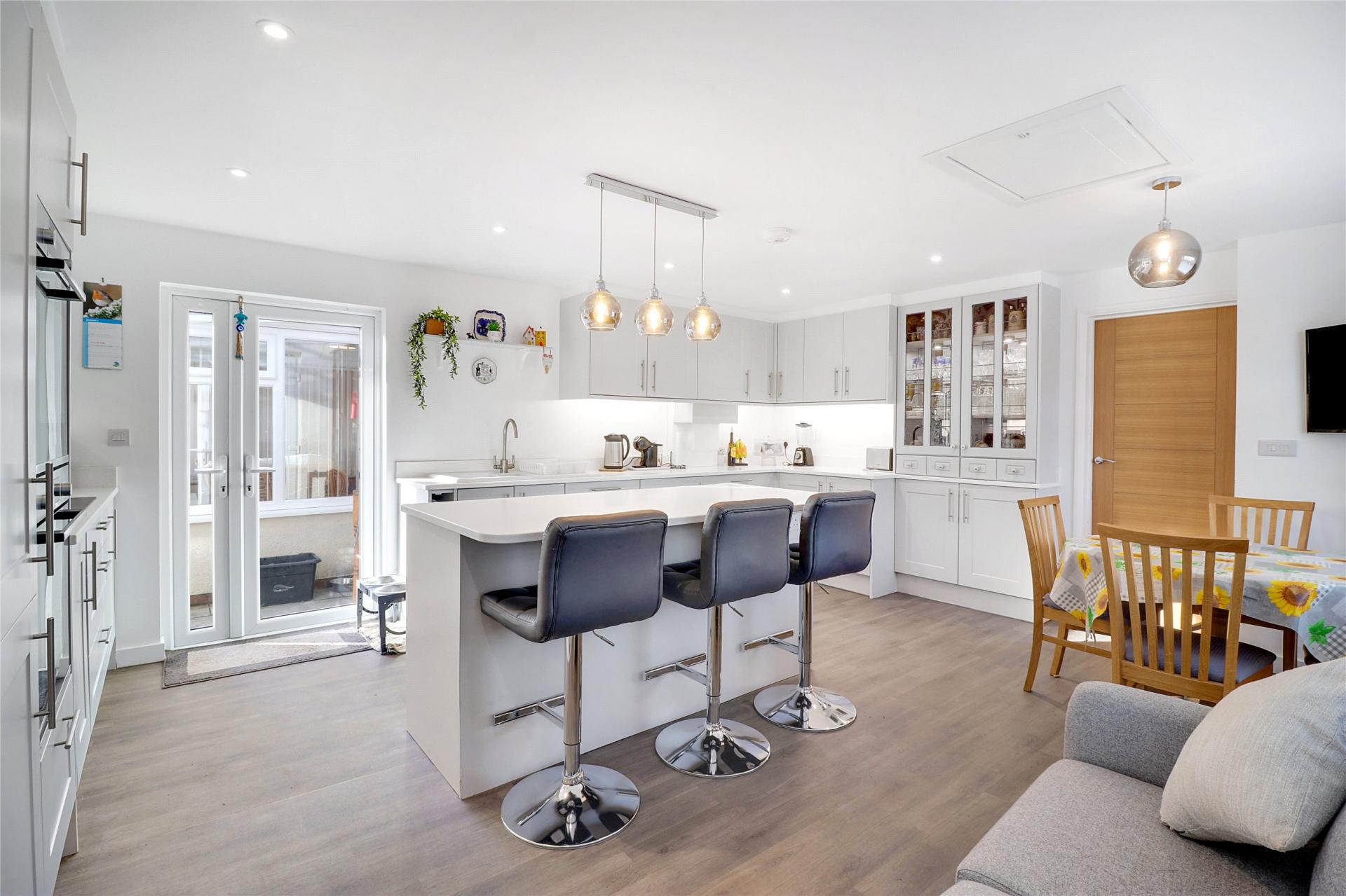 The accommodation is generously proportioned and thoughtfully designed. At the heart of the home is a newly fitted, modern kitchen, featuring attractive quartz worktops, a large range of wall and base units, and integrated appliances including a dishwasher, full-length fridge freezer, double oven, induction hob, and under-counter fridge. A breakfast bar provides the perfect space for socialising and entertaining, with room for a dining table and chairs.