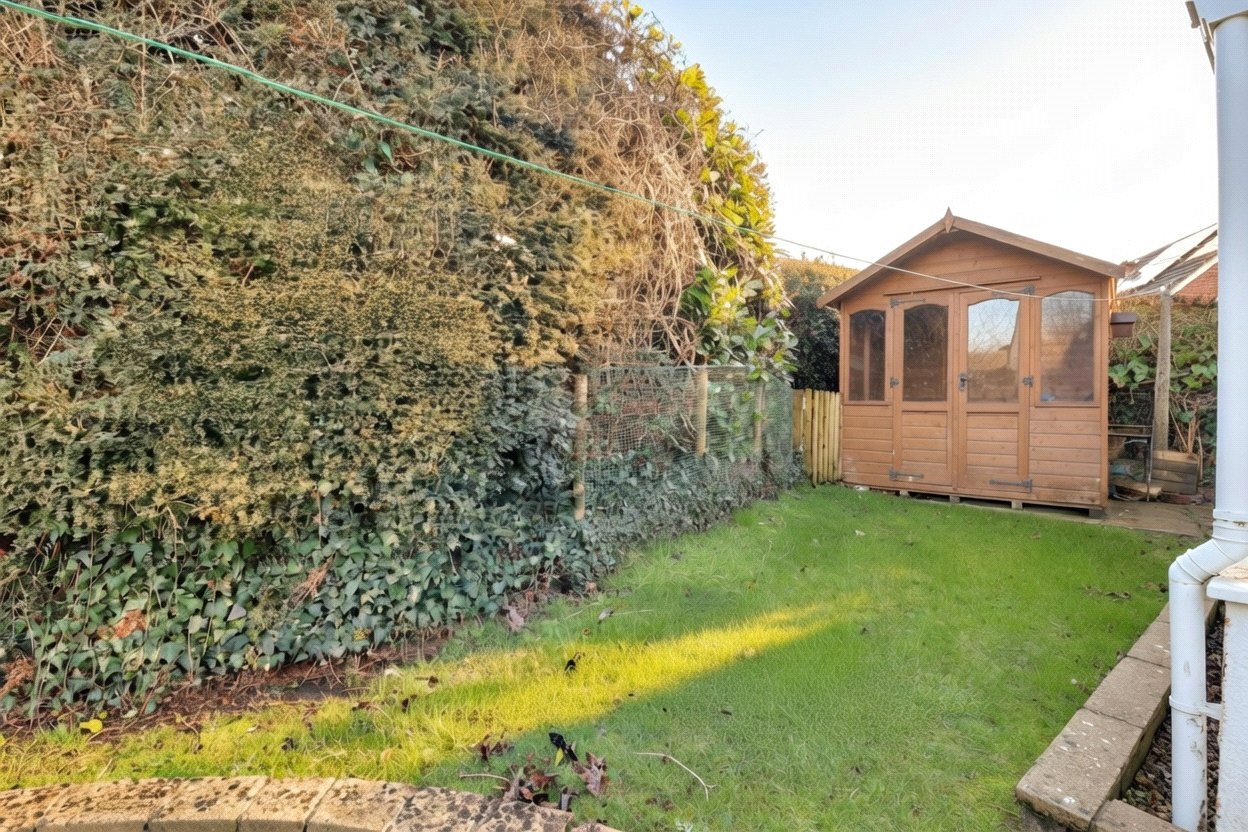 Externally, the property features a driveway providing off-road parking, a large garage with an electric up-and-over door, and steps leading to the front entrance and garden, with side pedestrian access to the rear. The rear garden is private and south-facing, bordered by mature shrubs and hedging, and includes a summerhouseideal for outdoor dining, relaxation, and entertaining.