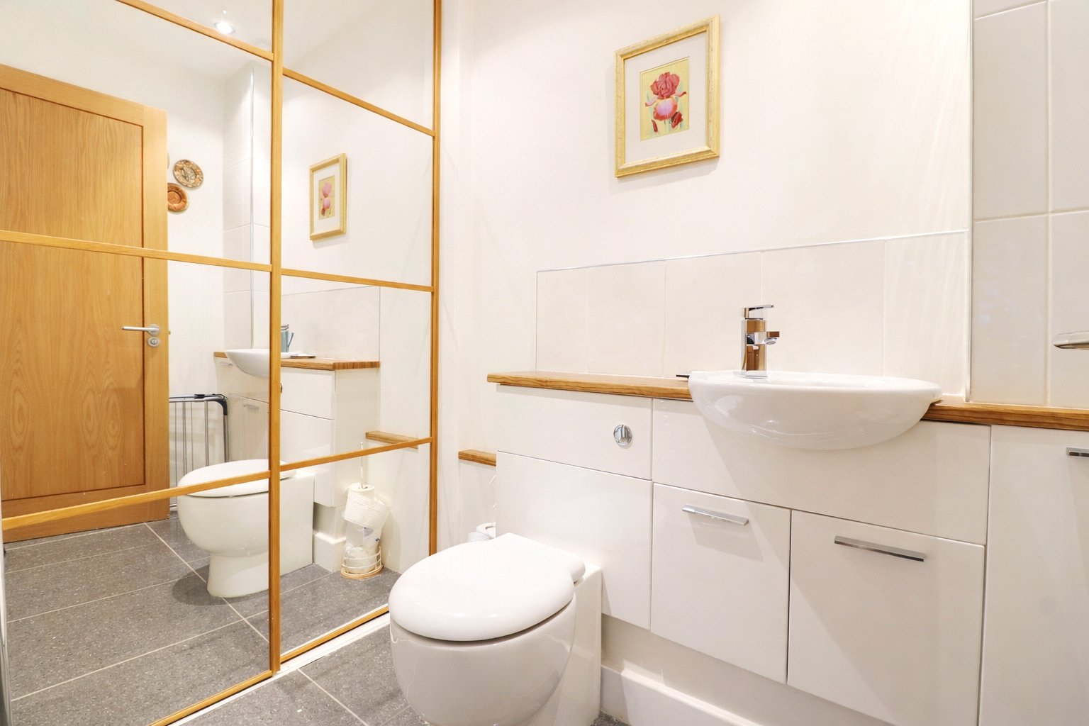 Also on this level is a WC, which incorporates a built-in storage cupboard housing the washing machine, along with an airing cupboard for additional convenience.