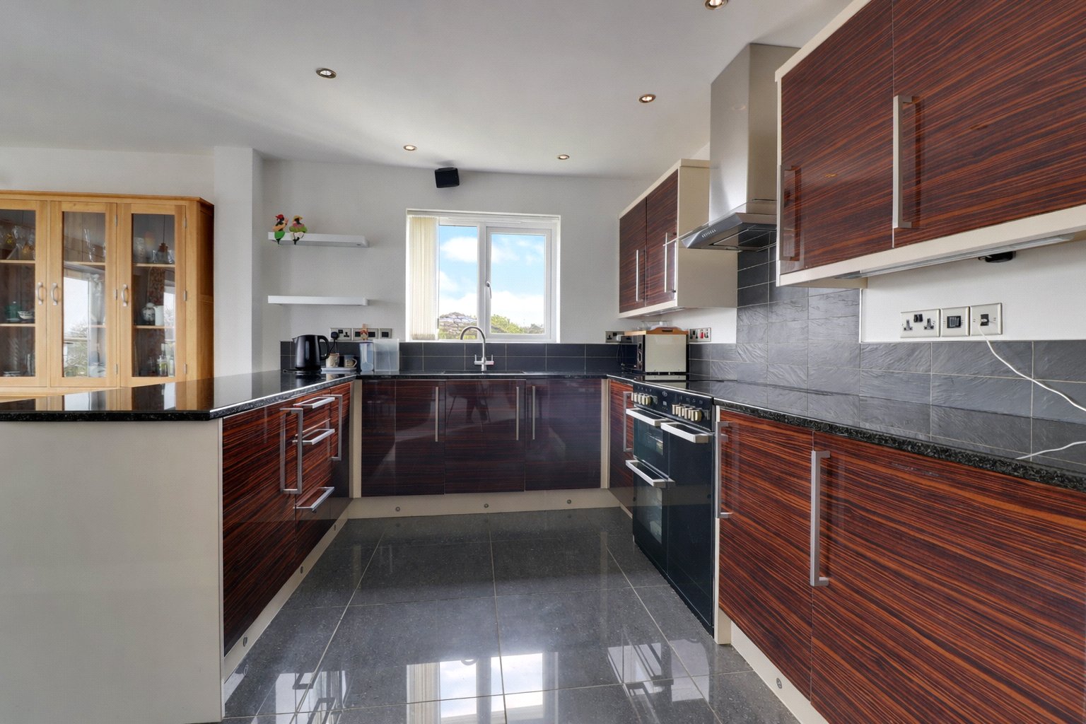Upon entry, the property offers a spacious and welcoming hallway which leads through to an impressive open-plan living, dining and kitchen space. This room is flooded with natural light and benefits from three sets of Juliet balconies, perfectly framing the outstanding views. The kitchen is modern and well-appointed, featuring a range of wall and base units, creating a stylish and practical space for both everyday living and entertaining.